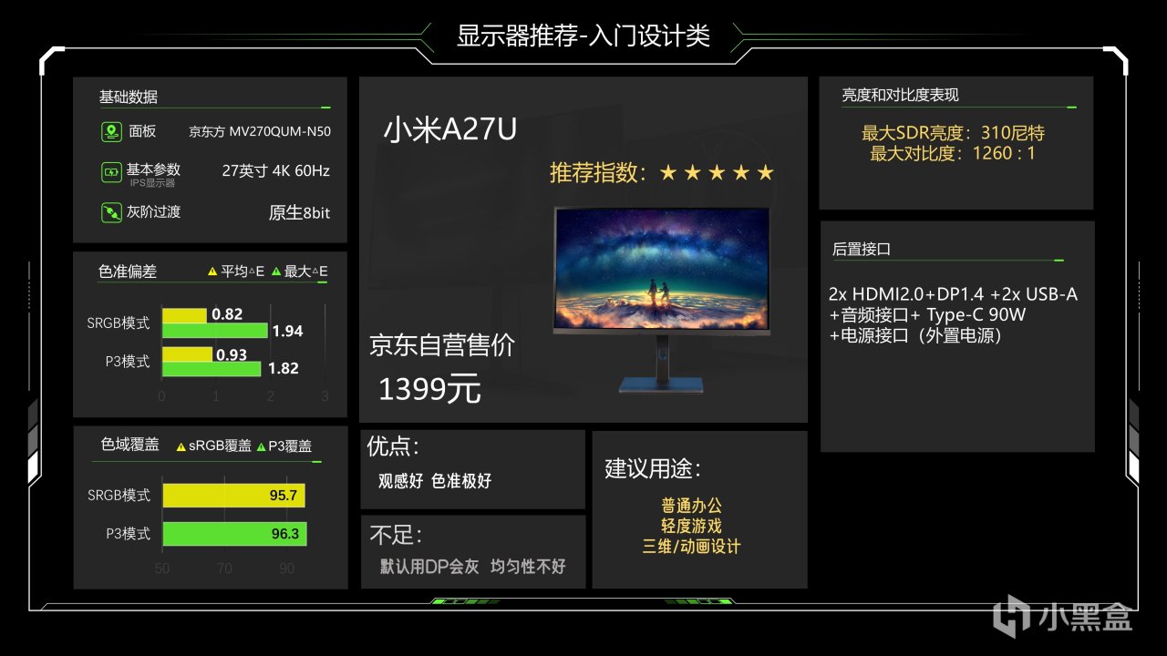 其实A27U我个人认为它的整体不如上一代(好到我现在还在念着它),但上一代已经完全停产了所以现在这个价位能选的也就它了,这台显示器的色准极其优秀,不过最大SDR亮度只有310尼特,如果有阳光直射的话可能会看不清,适合室内使用。