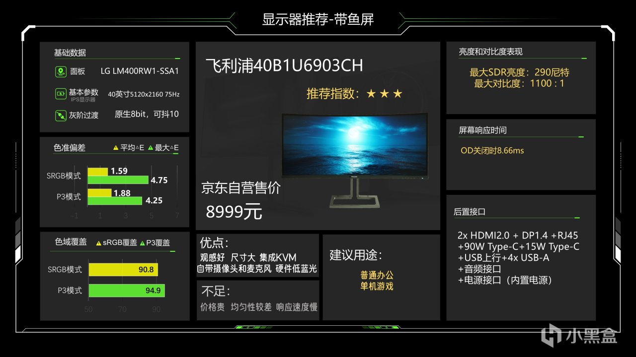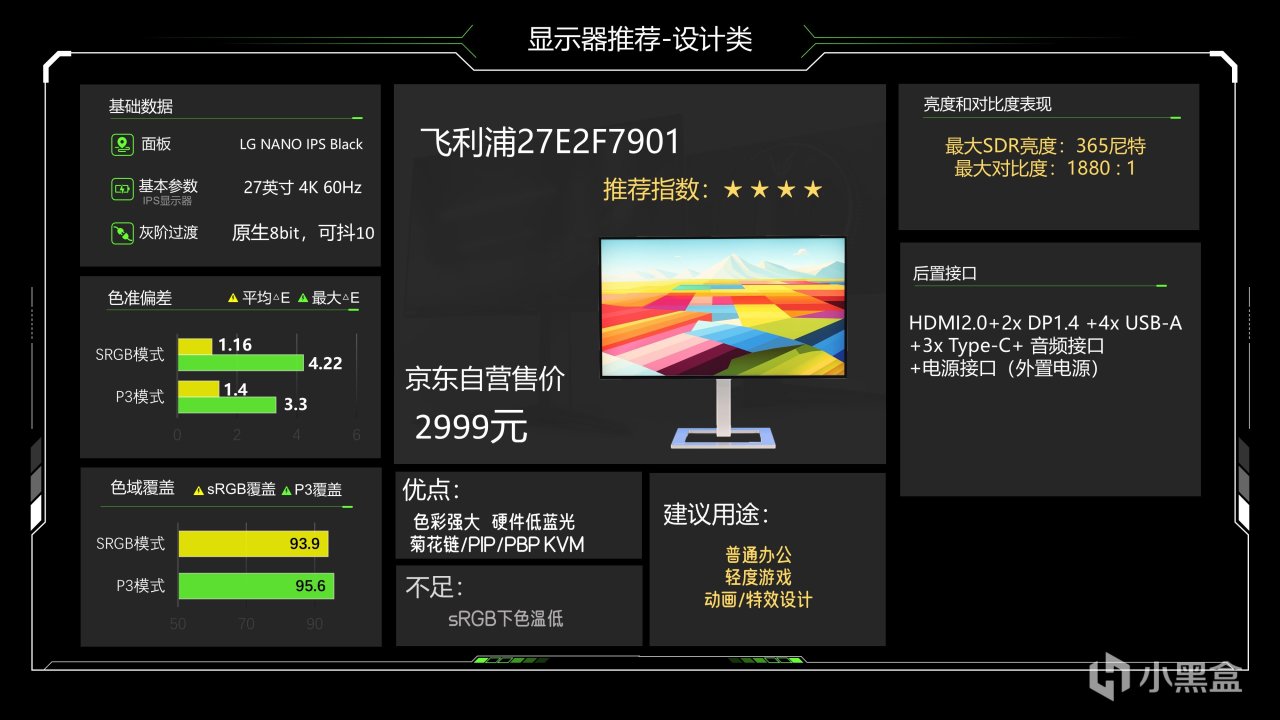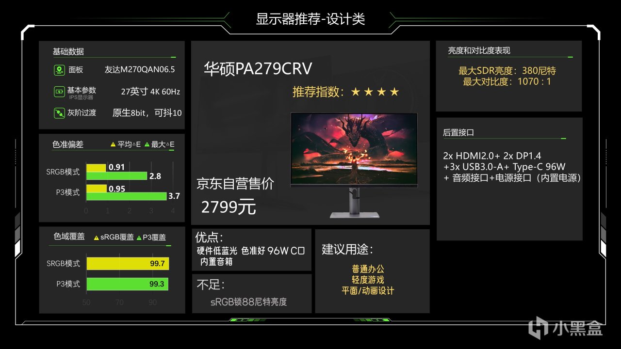 价格出现了离奇的上涨,现在2999元了,这台显示器是nano ips black产品,拥有强大的色彩表现以及不错的对比度表现,sRGB不锁亮度,并且还有硬件低蓝光,在拓展接口方面也做的非常充足,并且在PIP和PBP等功能上做的非常全面,这个显示器本身的调校谈不上特别好,略不如华硕那台,sRGB下色温比较低,不过P3调校的还不错,所以它适合用在一些特效设计以及动画设计等用途,当然这个用途PA279CRV也可以很好的满足