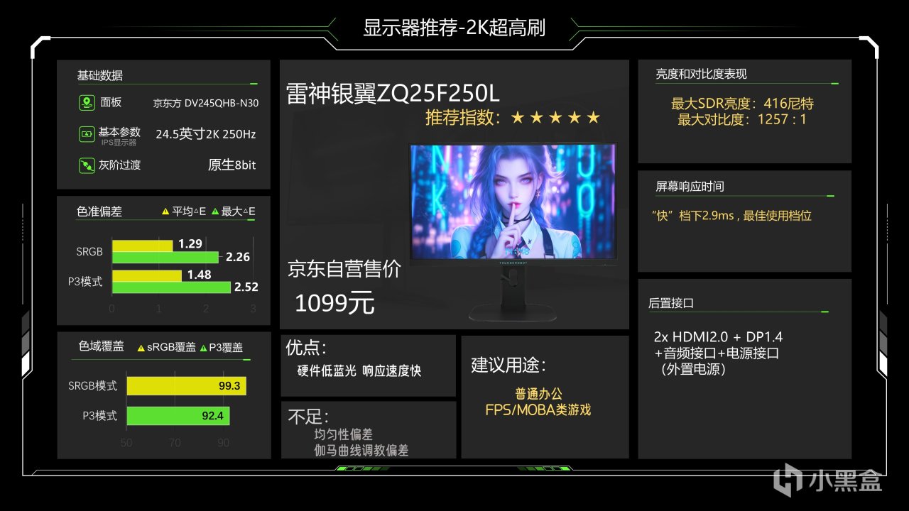 价格1099元算是稳定住了,这是一台我目前比较满意的显示器,对比老款改掉了之前的V字形底座,换成了扁平底座,这一点非常好,不占地方了,对比上一版还强化了一下色彩调校,尤其sRGB的色域覆盖和色准表现不错,也提高了SDR亮度,大幅优化了响应速度,现在2.9ms已经达到了T1级别的速度,可以用在FPS类游戏用途,不过均匀性方面的表现不太好,在评测视频里甚至被我打出了4.5分,我不知道为什么雷神的高刷显示器怎么这么容易均匀性表现炸裂,然后是伽马曲线调教略差,除了这两个方面之外这台显示器就几乎没有明显的缺点了,用来玩游戏和日常使用都不错