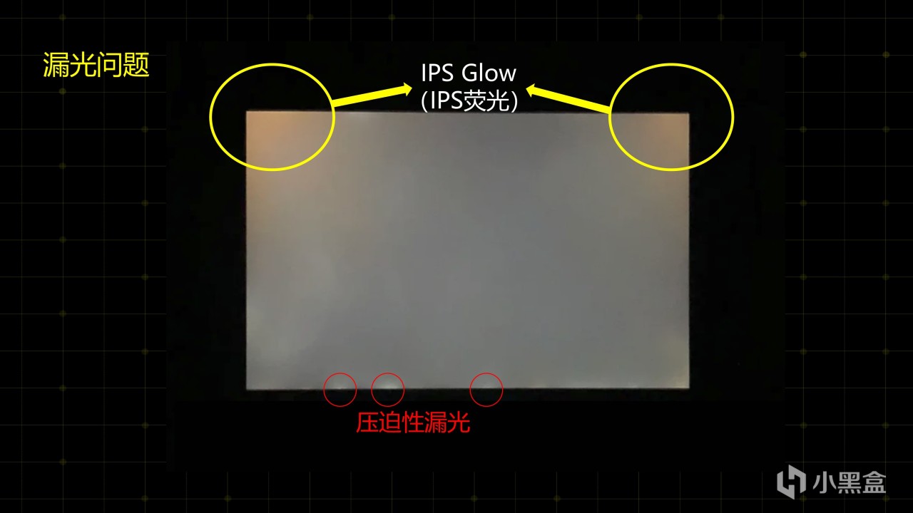 如果有明显的压迫性漏光可以选择退货,这个表现跟组装厂的技术和预算有关,当然还有Glow现象,这个问题IPS显示器比较明显,IPS显示器如果没有ATW 补偿膜的话是肯定会存在IPS Glow的,也就是一般认为的泛光现象,只是根据背光的不同实际被拍摄到的效果可能有区别,一般认为只要不影响日常使用就不用太关注,这里再强调一下压迫性漏光是需要售后的,大家可以通过转动视角观察,泛光区域会随着视角的转动发生变化的就是IPS Glow,如果不变化那就是压迫性漏光了。