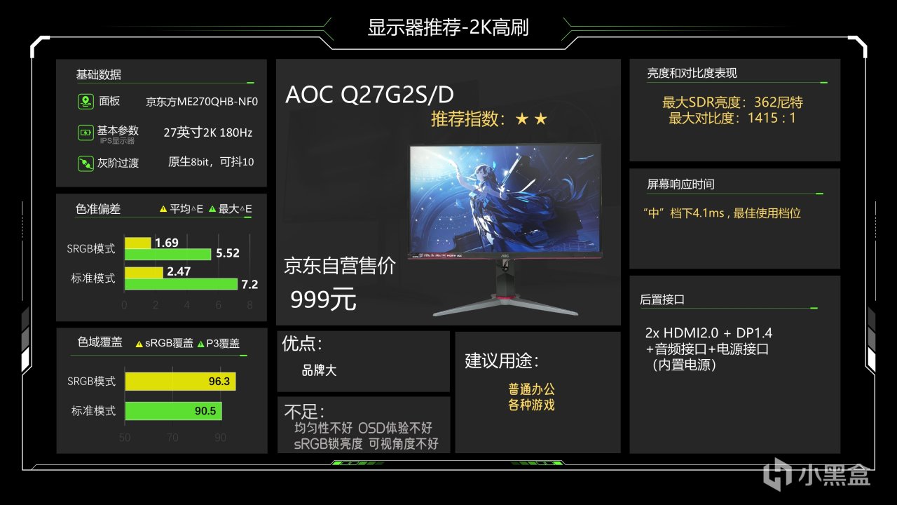 其实上这台显示器我是做了很长时间的心理建设的,大家的评论我基本都有看,一直都有人说怎么千元级没有AOC,其实是竞争力差,之前AG275QXPD就挺好,这个就上了,但也只是昙花一现,Q27G2S/D是吊车尾的水平了所以以前一直没上,我在思考了很久之后还是决定挂上来,如大家所见,根据我的测试结果这台显示器没有明显的优点,缺点倒是有几个,Q27G2S/D是罕见的新版不如老版的,老版的硬件低蓝光都被砍了,所以大家如果真的要购买的话,可以想清楚,单从使用上来看,这台显示器其实还可以,不算很差,只是量化数据分析上输的略惨,目前999元也不是很贵,能买,但产品力不算好,比较看重大厂的观众可以选择