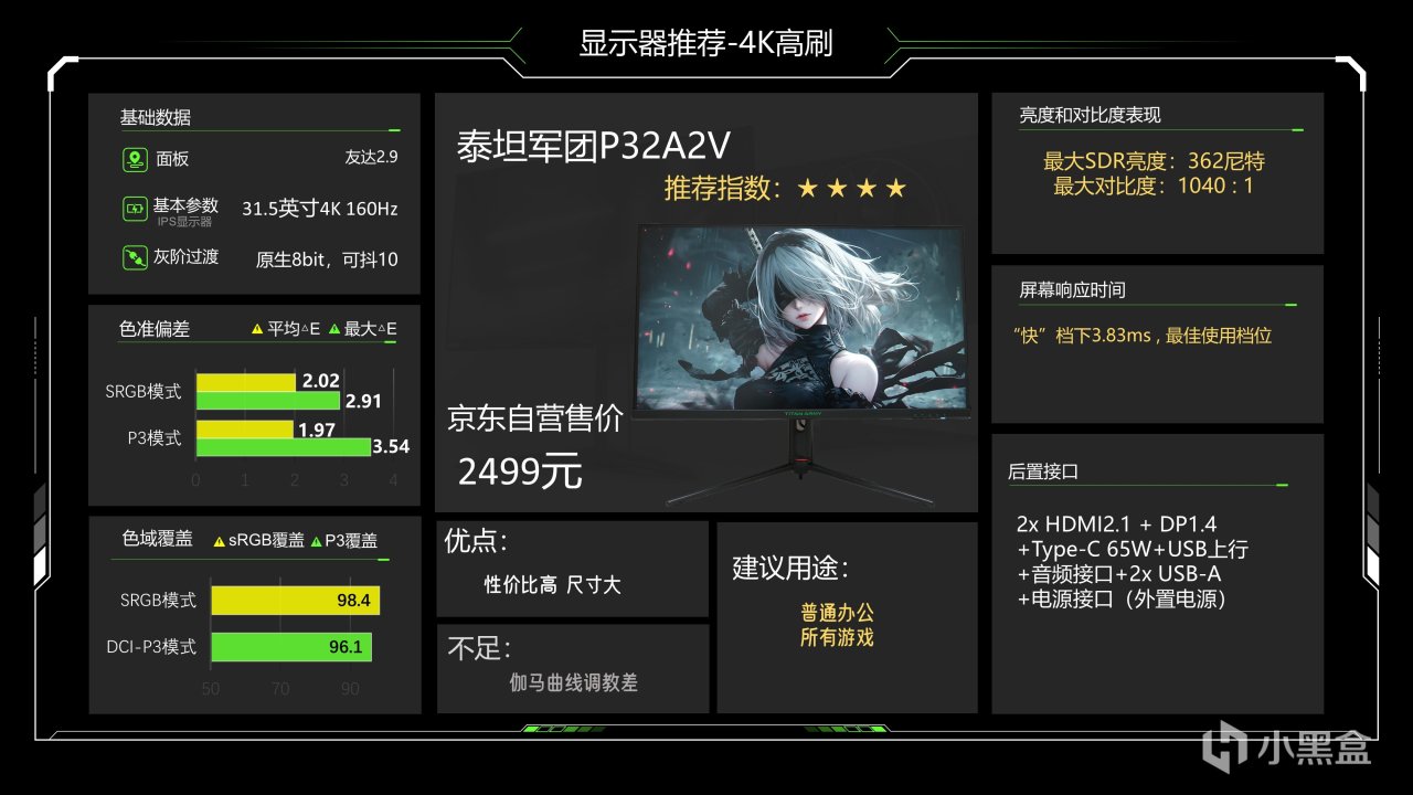 是目前相对便宜的32英寸4K高刷了,之前评测完觉得也值得买,这台显示器的色彩调教水平一般,色准表现不算优秀,最大SDR亮度362尼特,对比度1040:1,响应速度方面3.83ms也算不得快,均匀性方面表现也是一般(综合价格来看其实还可以),可以说这台显示器突出的就是一般全方位的普通,没有哪一项参数是特别好的,但价格比较低,常态价格2499元,我测的那台好像是1500卖掉的吧,大家也可以蹲一下成色比较新的P32A2V,价格能压得比较低,这台显示器支架非常大,大家如果要购买的话一定要注意桌面空间是否支持