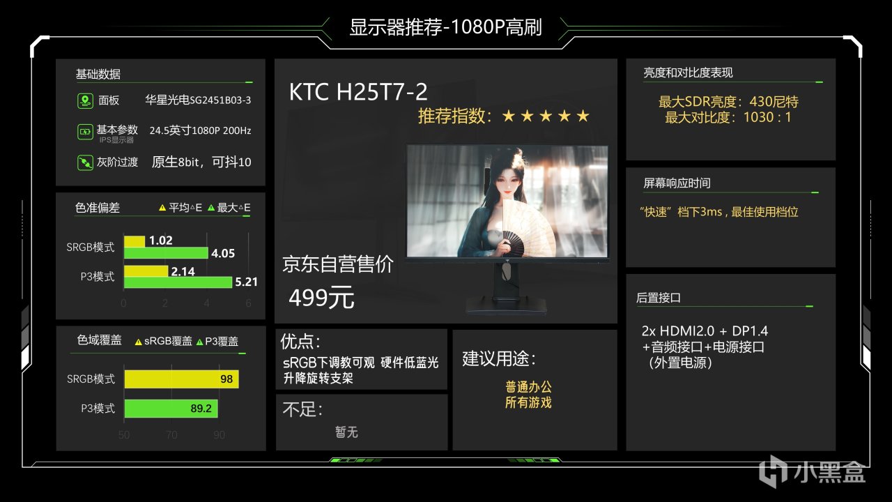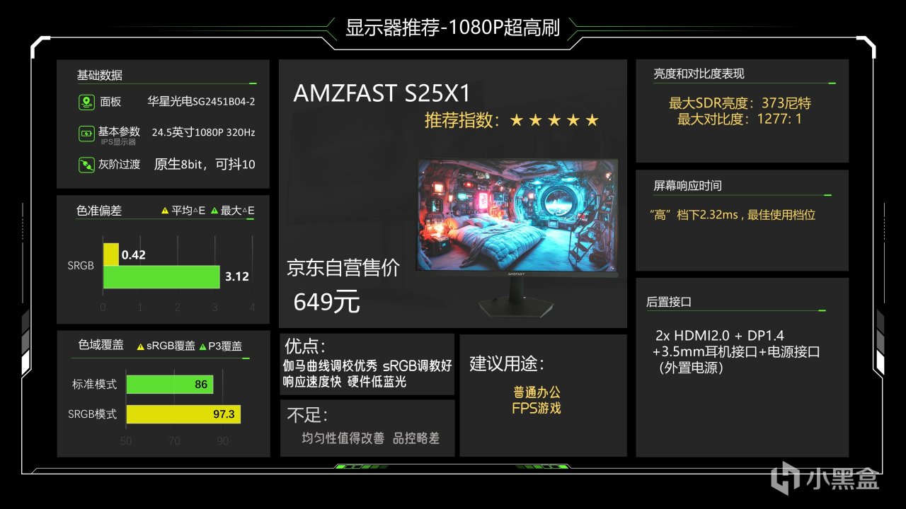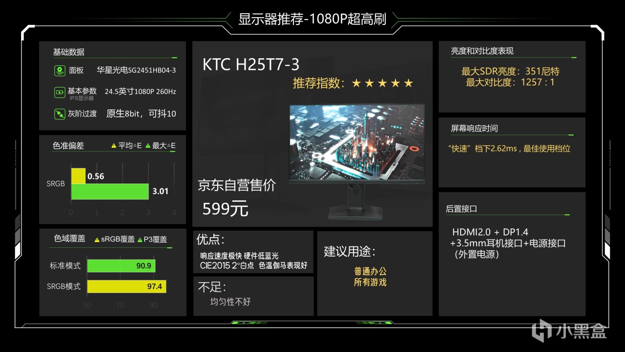 还是这个最便宜的型号,这是一个支持硬件低蓝光的24.5英寸1080P高刷显示器,基础的调教也很到位,标准模式最大SDR亮度可以达到430尼特,对比度和色温表现都还不错,伽马曲线拟合度也很高,sRGB下色域覆盖能达到98%,白点也非常精准,色准更是达到平均△E1.02,最大△E 4.05,非常可观,P3下则明显差一些,但满足游戏和影音需求没有问题,快速档下可以达到3ms,且过冲率7.44%,是目前这个档次非常不错的一个显示器了