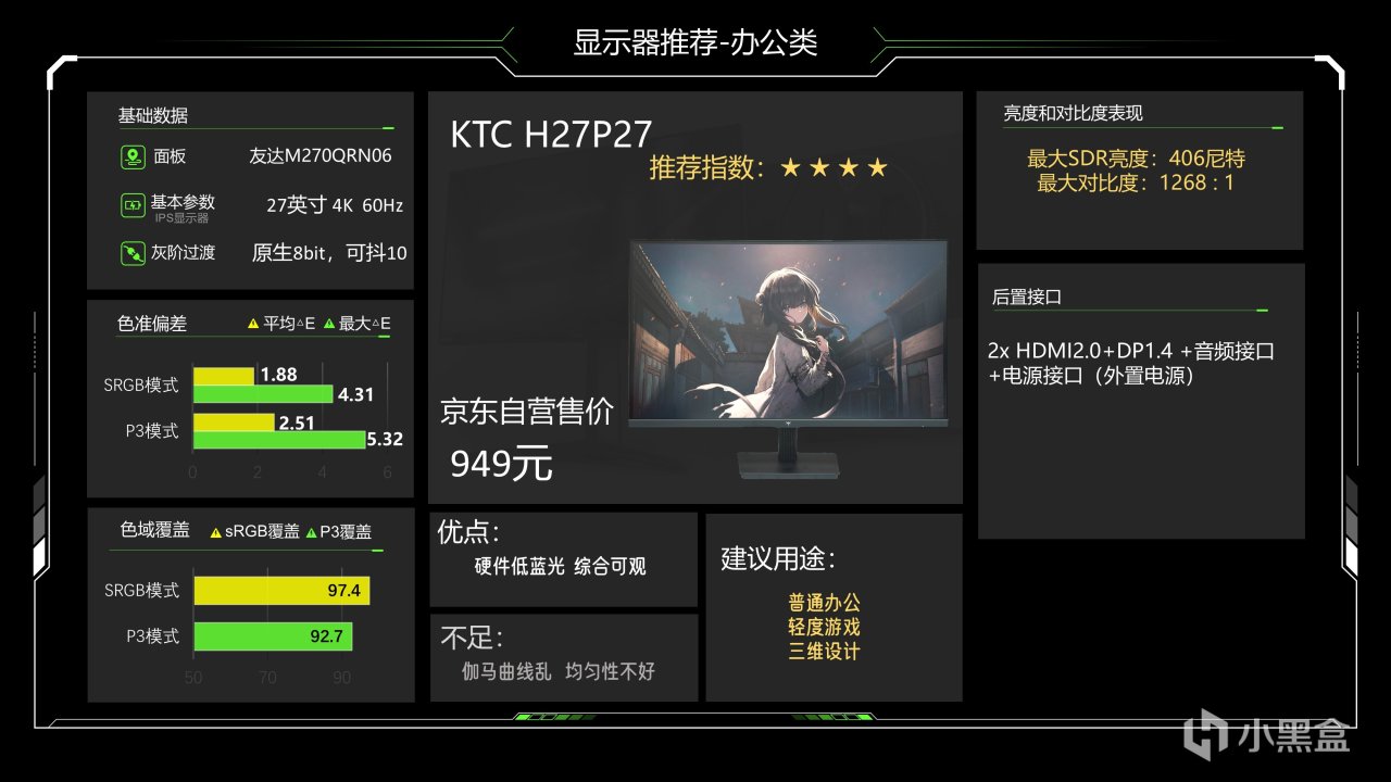 价格949元,需要特别说明这个显示器没有AdobeRGB色域,它只有原生色域、sRGB色域以及P3色域,并且屏幕 反射率偏高,有点像镜面屏,默认是暖色只有6100K左右,可以切换标准模式,即可达到6700-7400K级色温(可调),作为一个办公用的屏幕,它的素质是达标了,可以接任之前P6的工作,现在厂商并不热衷于推进这种定位的产品,所以参数方面不会多好看,这种屏幕用来办公、看电影以及玩玩单机游戏是可以的