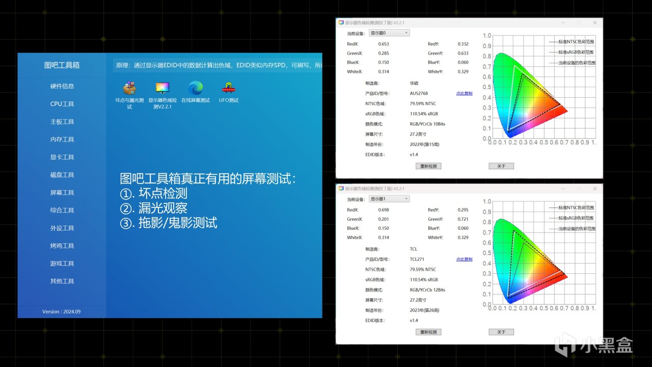 我发现有的观众喜欢用图吧工具箱的显示器色域检测来对显示器的所谓色域进行测试