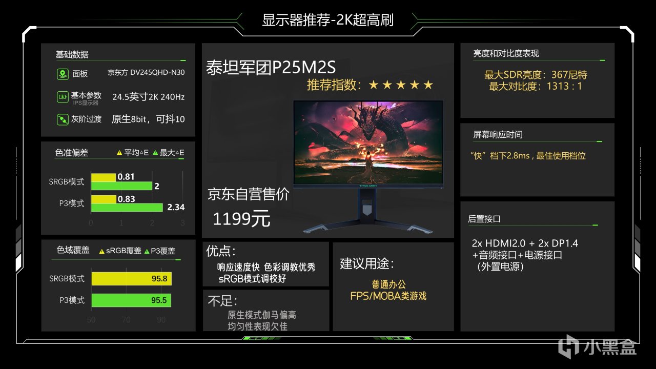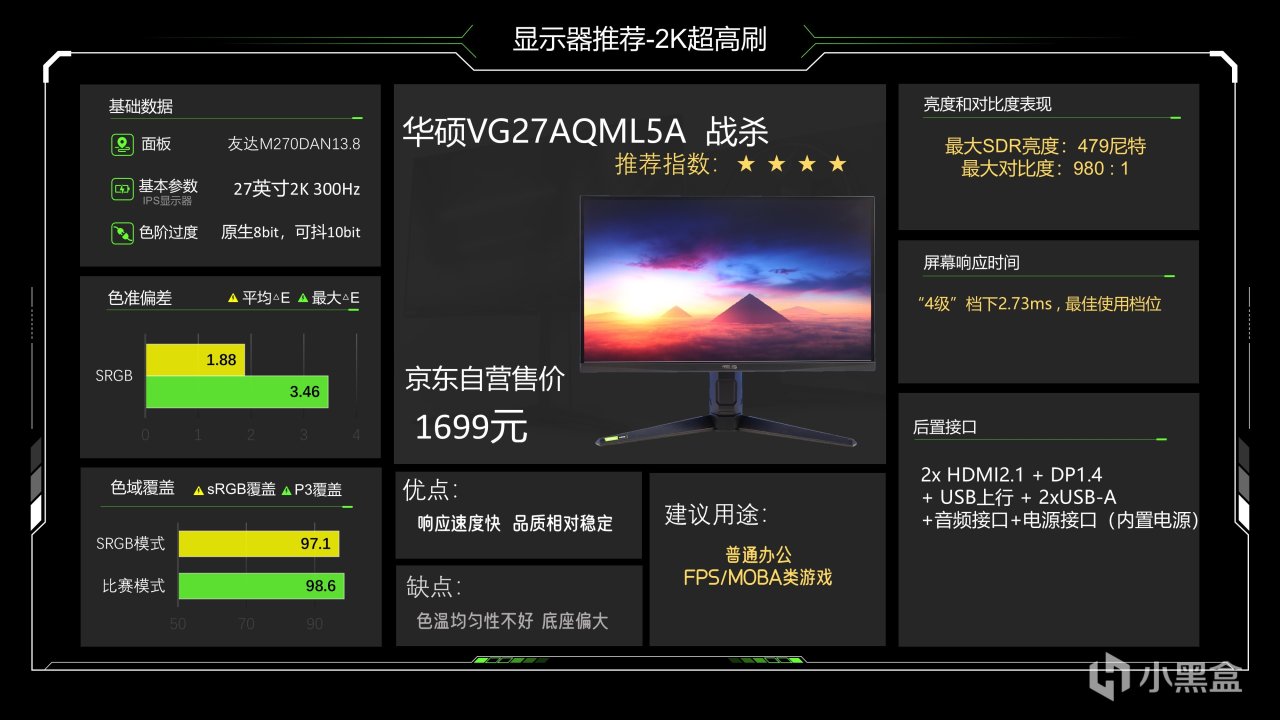综合实力强于之前260Hz那款,不过对比老款少了硬件低蓝光,响应速度提升到了2.73ms,SDR亮度479尼特也算高,不过对比度倒是略有下降,变成了980:1,色彩调教只能说一般般吧,这台显示器我可以说品控是相对稳定的了,它的不足主要体现在色温均匀性不好以及底座偏大,真的该换平底支架了,友商们已经用手上几代了,这台显示器价格略贵现在是1699元,适合预算偏高的FPS游戏玩家,当然用来玩其他游戏也可以