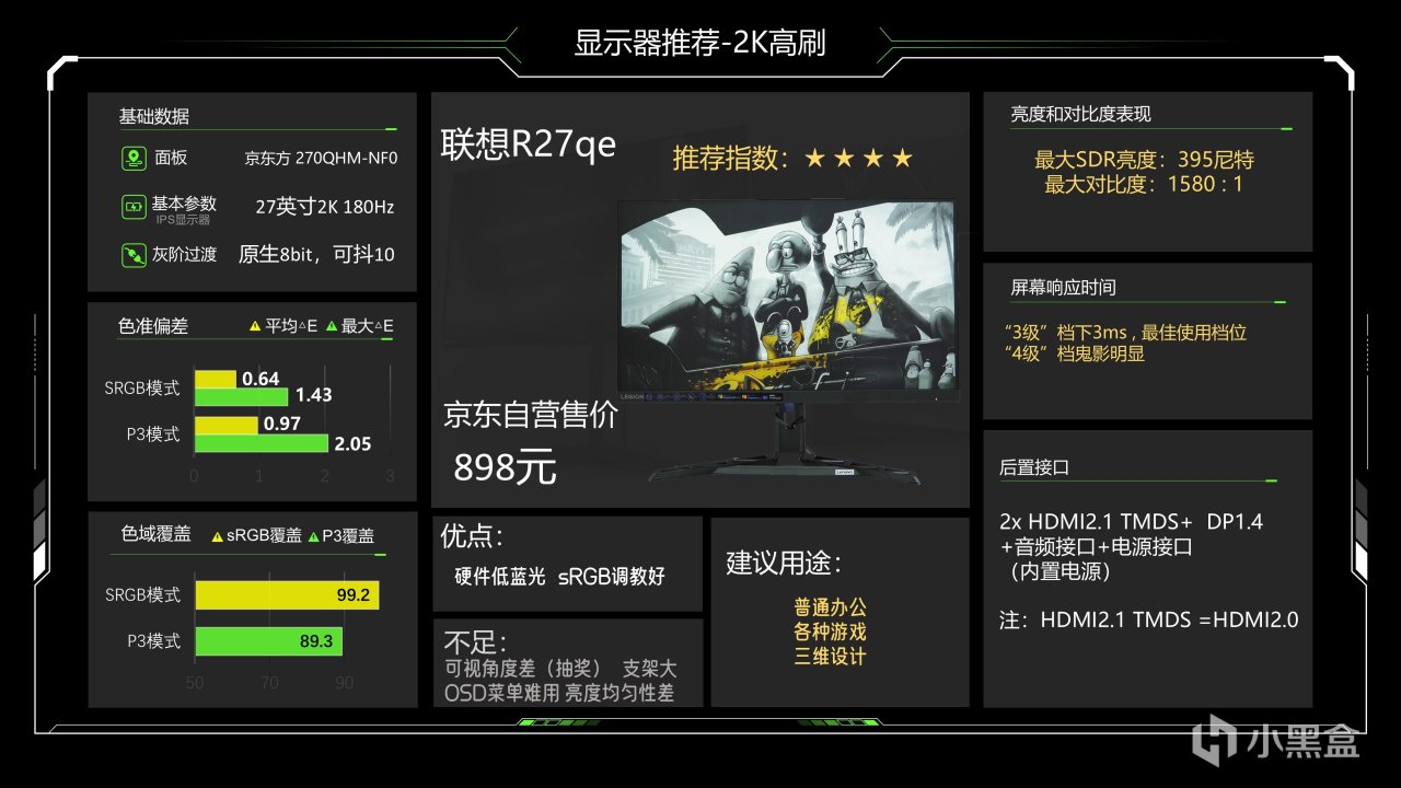 上次618清单被我下掉了,因为当时出了一个R27qe Gen2,我当时以为应该是原地升级款,然后时间上又来不及测所以才去掉R27qe,结果等我前段时间真的上手去测R27qe Gen2之后觉得实在是太失望了,R27qe Gen2可以说是一个完完全全的下位产物,它根本不配叫R27qe Gen2,所以以前的R27qe又重新回来了,这台显示器我在不同时间段都观察过其他人的测试结果,发现对比我自己首发测得数据其实差不多,说明这台显示器品控相对稳定,但缺点也还是存在的,比如说丧心病狂的OSD物理按钮,非常不好用,又比如说可视角度差,以及均匀性差和底座略大,它的优势在于sRGB调校还不错、对比度不错,实际画面观感我觉得挺好的,3ms的响应速度也算快了,目前价格899元我觉得性价比还可以,用来玩游戏和办公都挺好的,我还是希望联想推出一款认真一点的迭代款,把可视角度、支架、OSD按钮的问题解决好,竞争力还是不错的