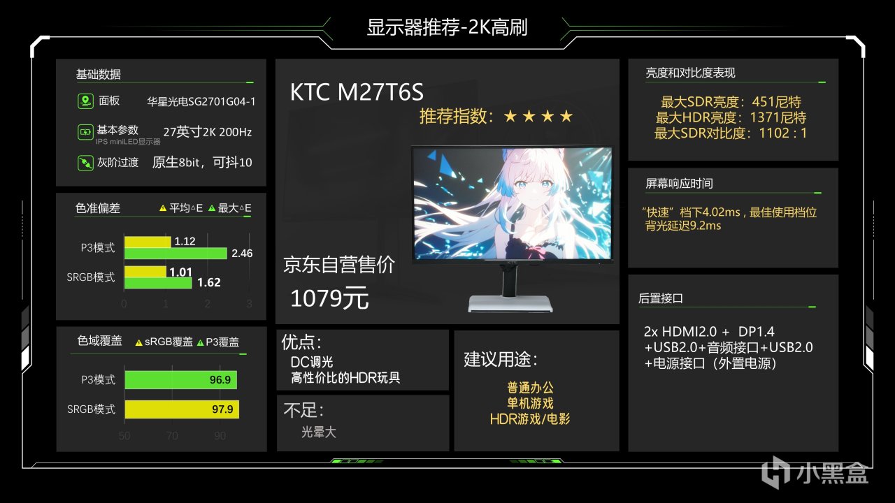 除了前面提到的这些问题,其他方面我觉得它就还算不错,价格1079元也不贵,算是一台高性价比的HDR玩具,可以用来玩HDR游戏和看HDR电影(其实它的HDR调教做的很一般),非HDR用途也可以用,毕竟价格不贵,如果不看它的miniLED背光的话,它的基础实力大概跟700元左右的2K高刷差不多,多花三百多换来了这个模具和miniLED背光,还可以