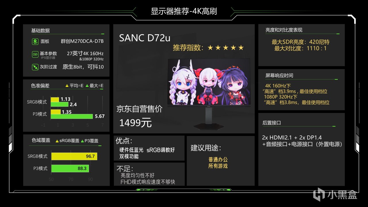 1499元就可以买得到,也是传统背光显示器,拥有非常出色的观感和调校,具体的数据大家可以简单看一下,sRGB和P3下平均△E均在0.6出头,无鬼影灰阶响应时间3.67ms,这个倒不算很快,常规T2水平,均匀性表现也不错,跟D72u比起来,其实如果你不看1080P超高刷的话,它的综合实力是强于SANC D72u的,但320Hz对比160Hz能带来更快的运动清晰度,可以说这是一台兼顾游戏和入门级设计的显示器,在SDR用途下它的表现力是很强的