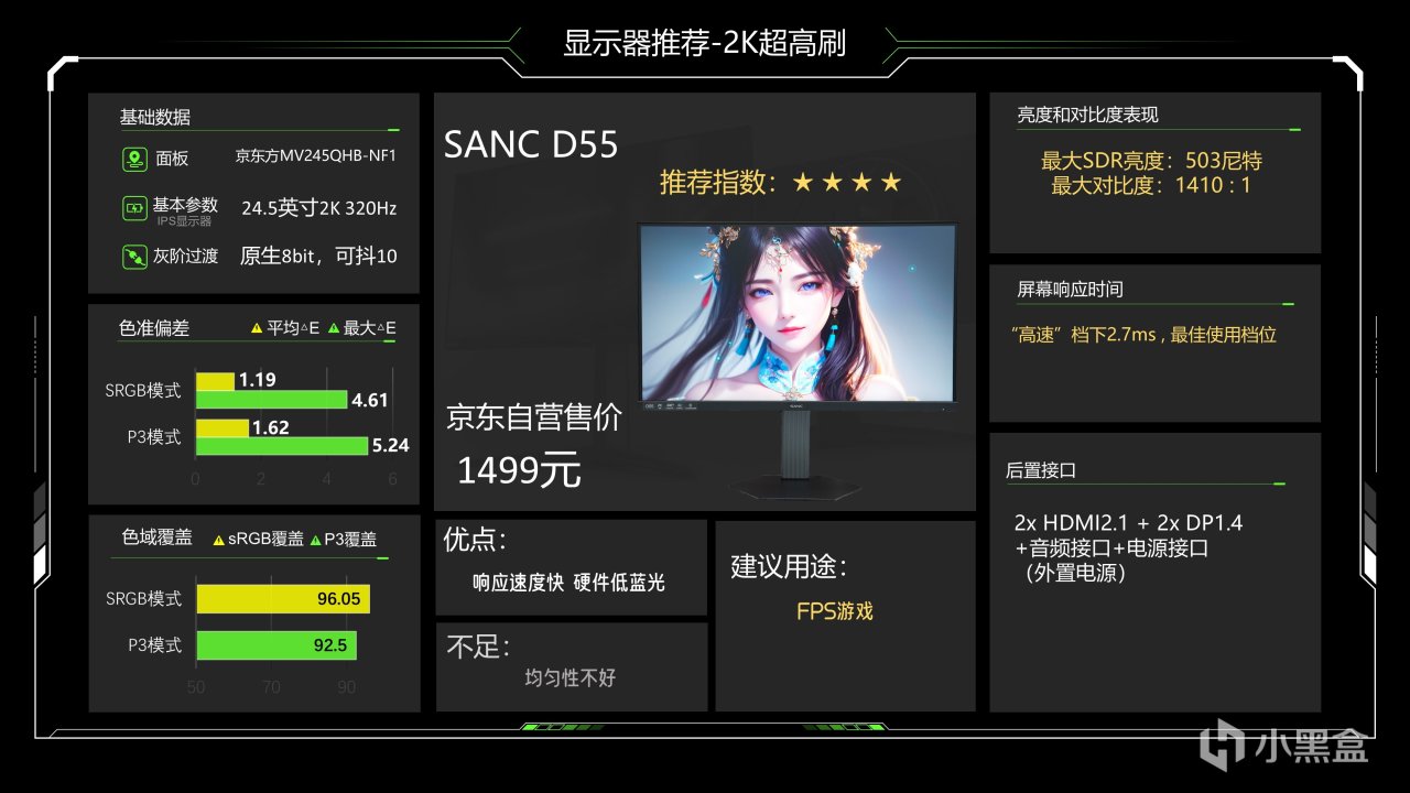 先说它的缺点,均匀性不好,但不算很烂的地步,比雷神那台要稍微好点,这台显示器刷新率进一步提高到320Hz,保留了HDMI2.1接口,可以拉满2K 320Hz 10bit,SDR亮度非常高能达到503尼特,对比度也能1410:1,亮度对比度表现非常强大,色彩方面的调教也还不错,响应速度可以做到2.7ms,非常快,不过价格来到了1499,比较适合FPS发烧友以及看中HDMI2.1接口的玩家,重点一定是这个可以拉满输出的HDMI2.1接口,如果你不是很看中这个HDMI2.1接口的话,D55的优先级其实不高。均匀性这个问题简直是老生常谈了,我觉得以这台显示器的定位和特性,可以把亮度对比度做的一般点,然后把均匀性做好一点,这样它的综合评价还会更好