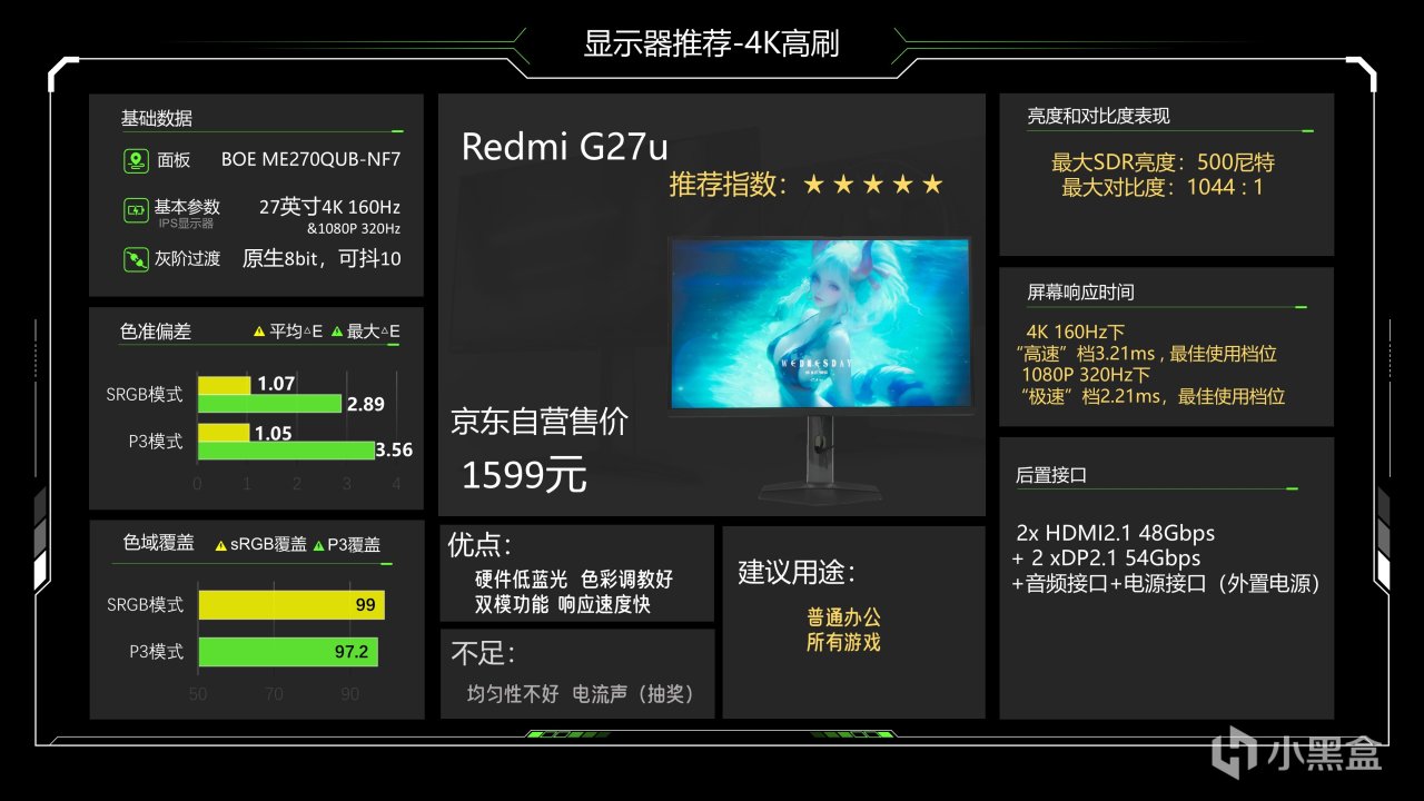 然后来看目前4K双模显示器里性价比最强的显示器,Redmi G27U