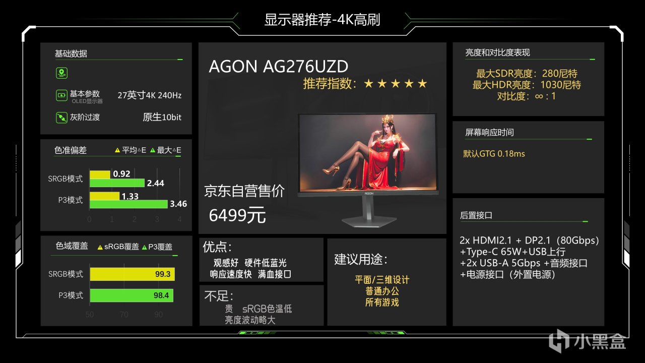 这是一台QD-OLED显示器,整体调校水平还不错,适合所有游戏以及观影需求,HDR表现也还可以,不过高光细节不算好,OLED的通病就是全局亮度不高以及未来可能烧屏。其实这种价位的OLED调教水平以及品控都还不错,其他品牌这个价位的超高刷OLED显示器也是可以随便选的,差异很小,只要不买到WOLED面板的显示器就可以了,WOLED面板的RGB排列方式有问题,会导致观感不好。