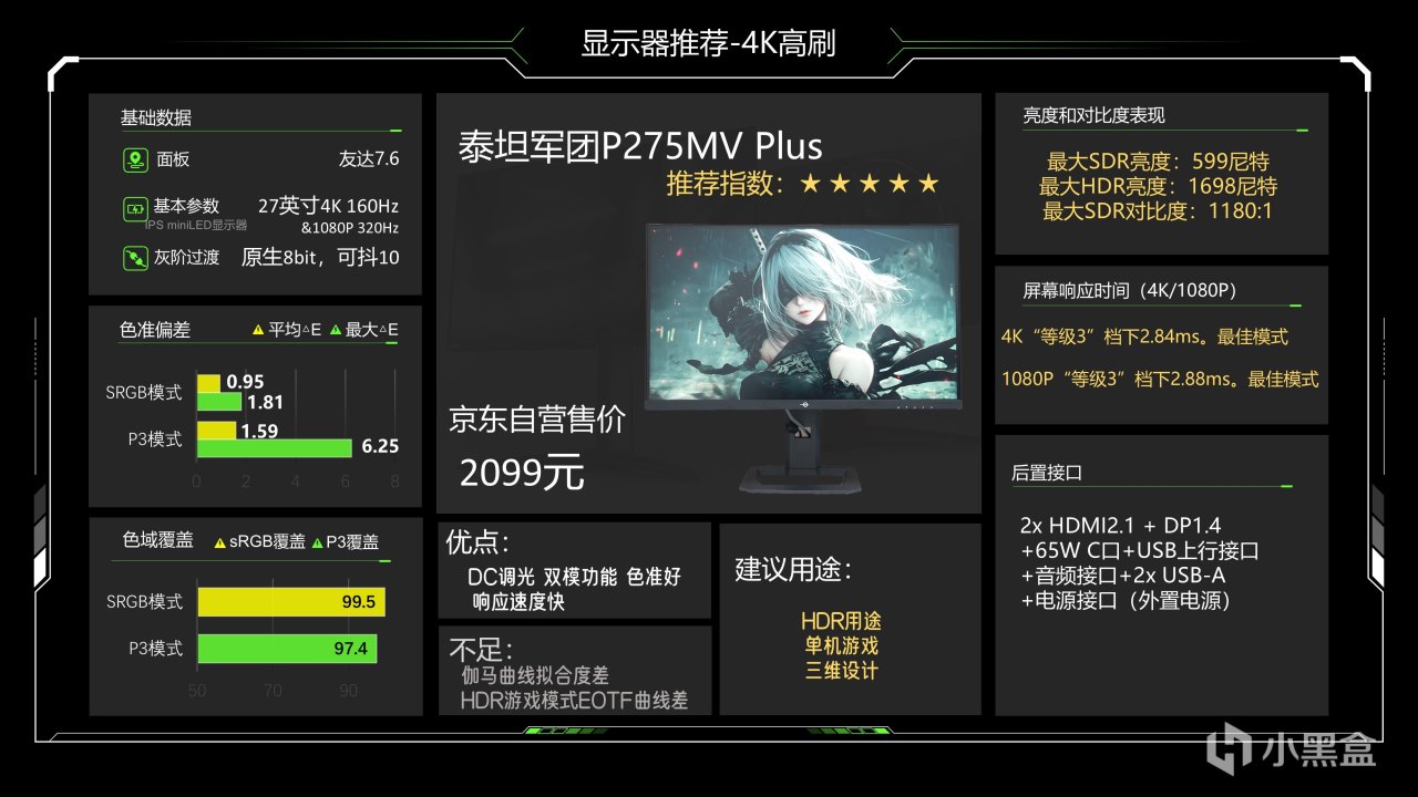 这个显示器之前国补1699元,现在没国补了就要1999了,虽然是HDR1000认证,泰坦军团这一台的小窗HDR激发亮度表现不错,色准表现也好,响应速度非常快,4K和1080P超高刷都能达到2.8ms左右的响应速度,SDR亮度599尼特在miniLED里属于一般水平,值得一提的是这台显示器如果要开HDR用的话尽量用HDR电影,因为HDR游戏模式的EOTF曲线比较烂,会导致HDR画面偏暗,这个问题现在都还没修复,伽马曲线的调校也不咋好,有一个65W的C口,接口很丰富