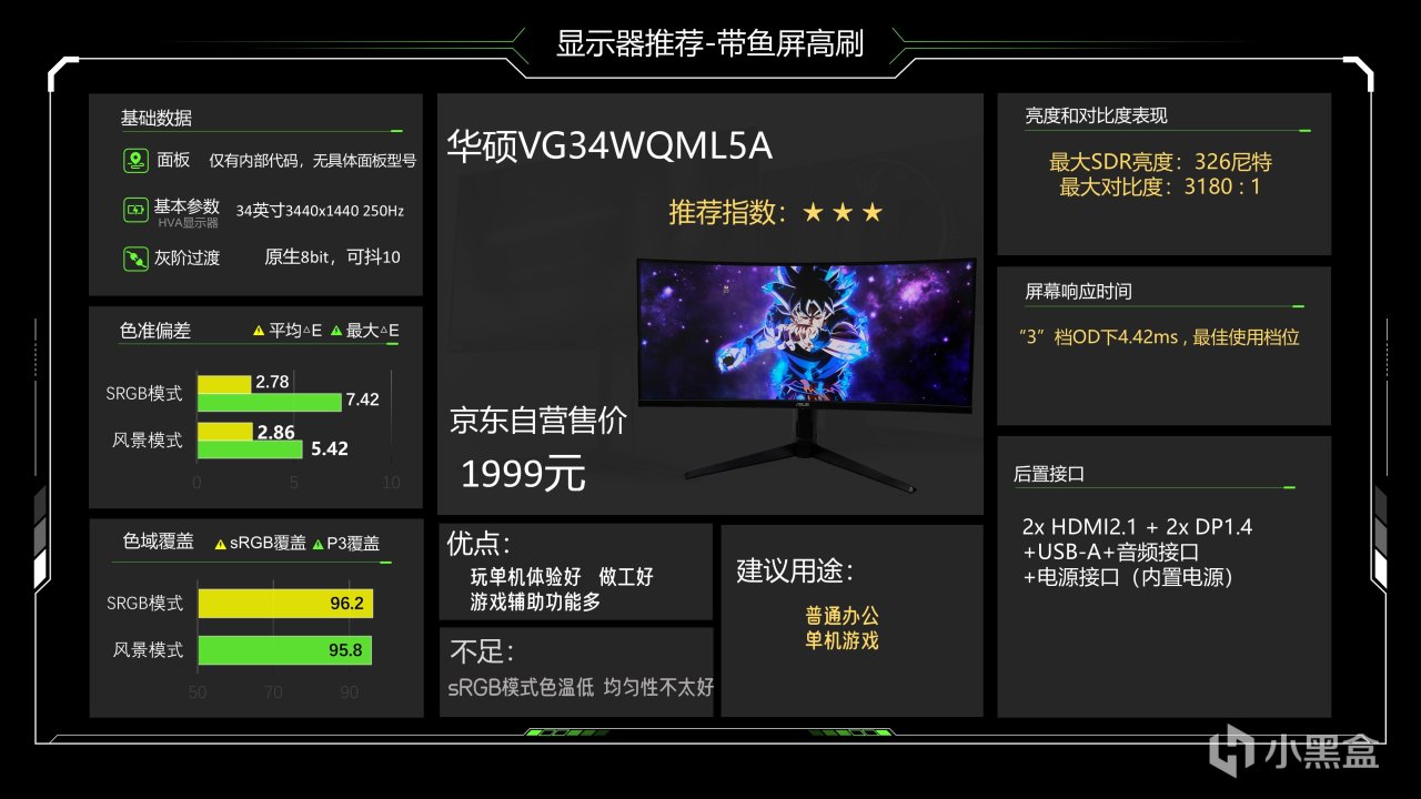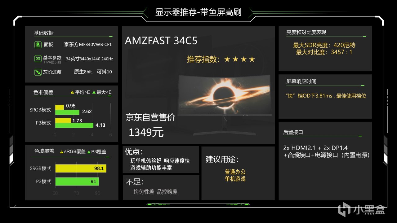 这是一台1349元的HVA显示器,其实目前对于HVA的定义已经比较宽泛了,只要你的VA面板速度够快就都能叫HVA,这跟所有速度快的IPS面板都能叫FAST IPS是一个道理。34C5是目前我测试的传统背光带鱼屏里响应速度最快的了,快档下达到了3.81ms,亮度对比度表现不错,色彩调校也还不错,但均匀性表现非常差,据我这两个月的观察似乎品控也不太好,所以问题还是要跟大家讲清楚一下,带鱼屏画面比较宽,用来玩单机游戏、沙盒游戏之类的都比较好,这台显示器的游戏辅助功能也比较丰富,表现还可以,能给大家作为拓展选择