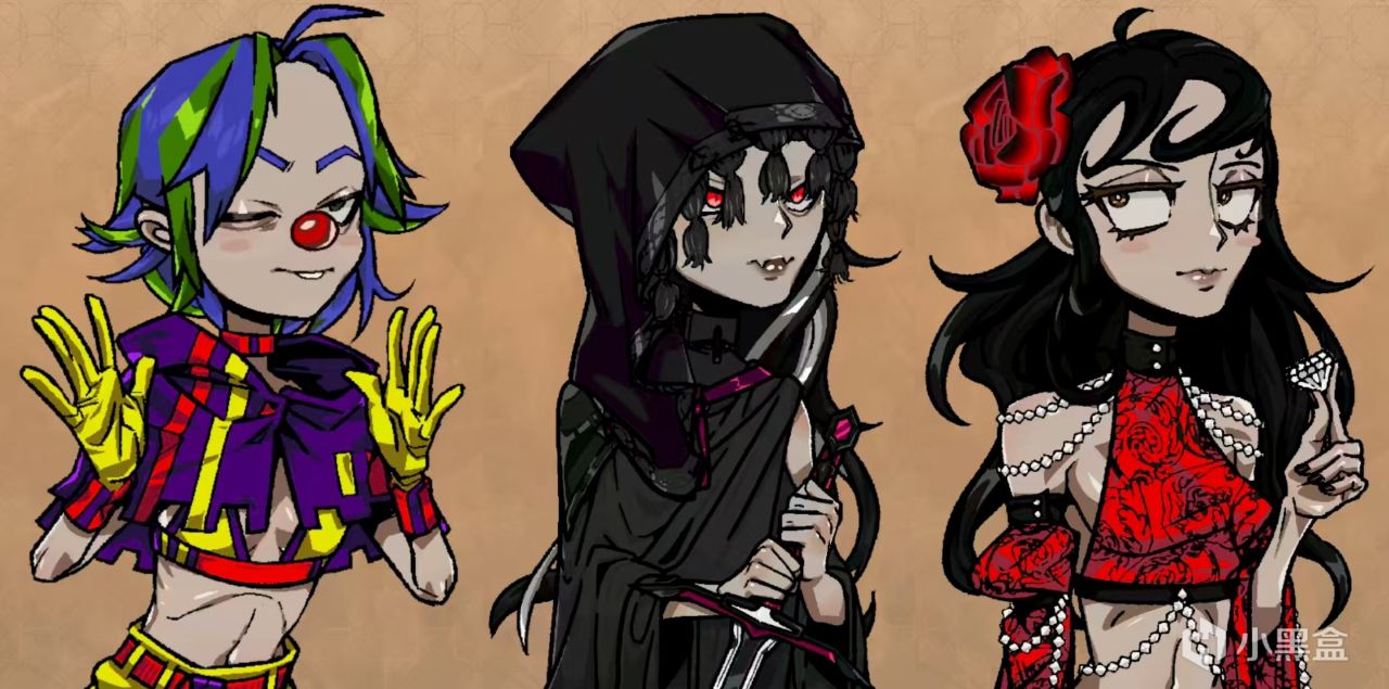 从左到右分别是:“色彩缤纷”小丑女、“虔诚侍剑”邪教徒、“猩红蔷薇”奢贵妇。