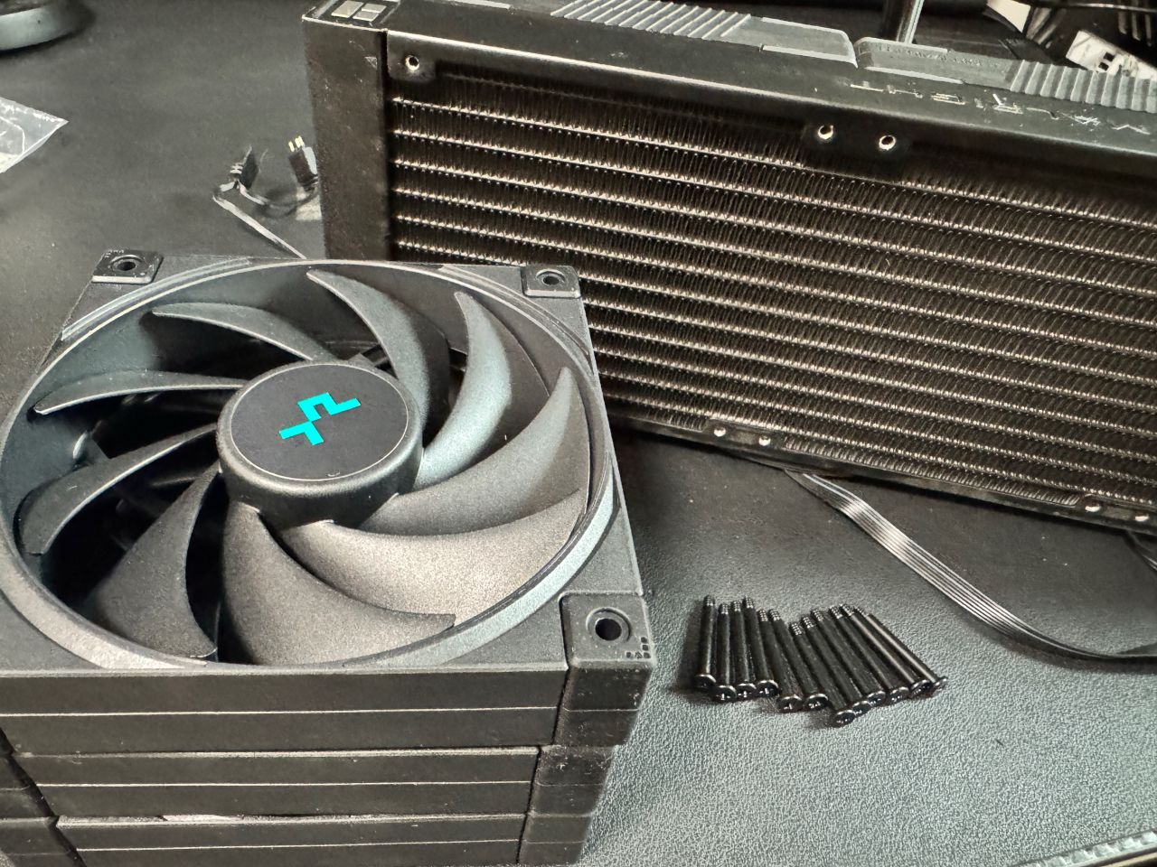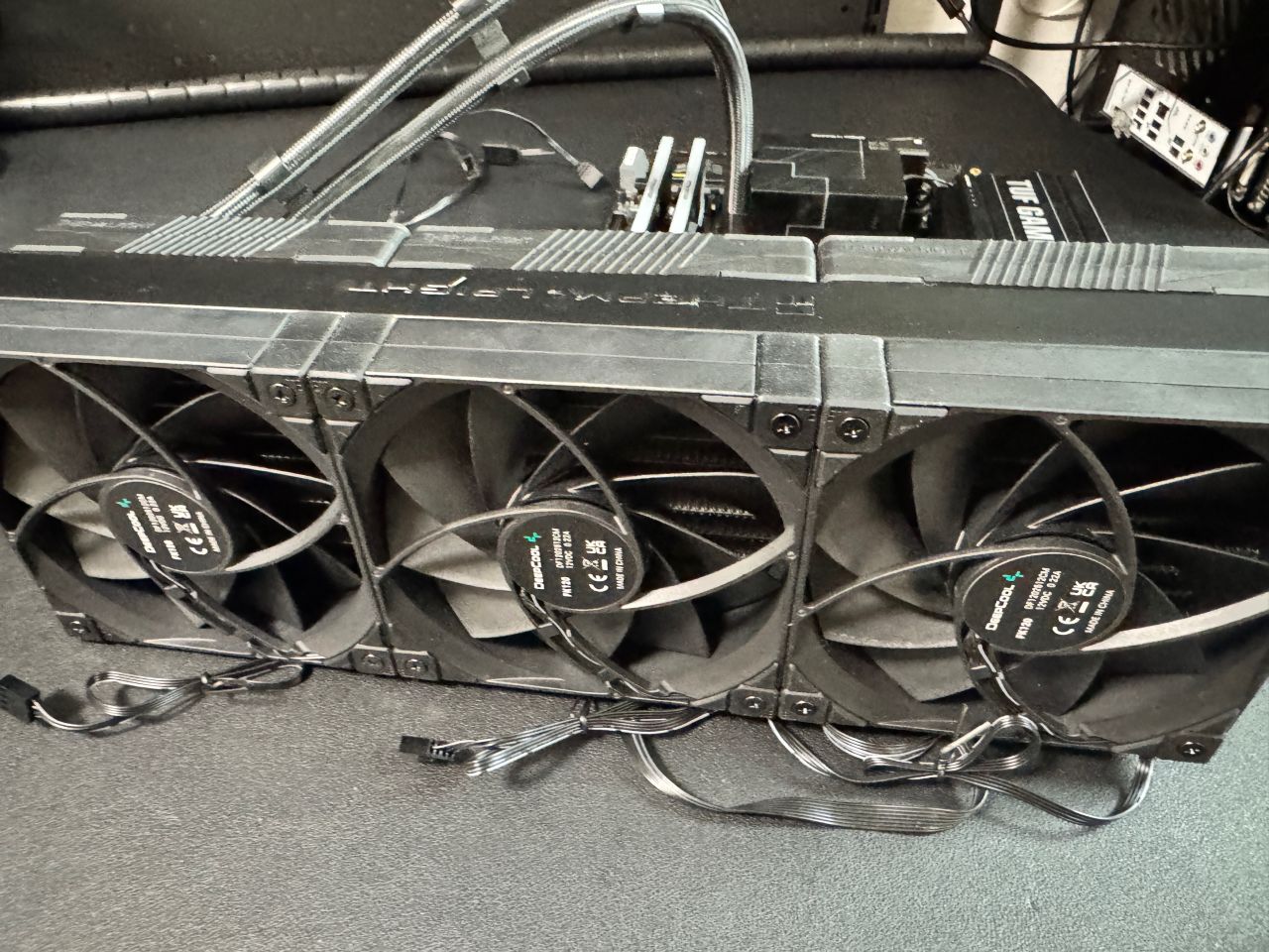 正好手頭有三顆九州的無光扇,用長螺絲擰到冷排上。