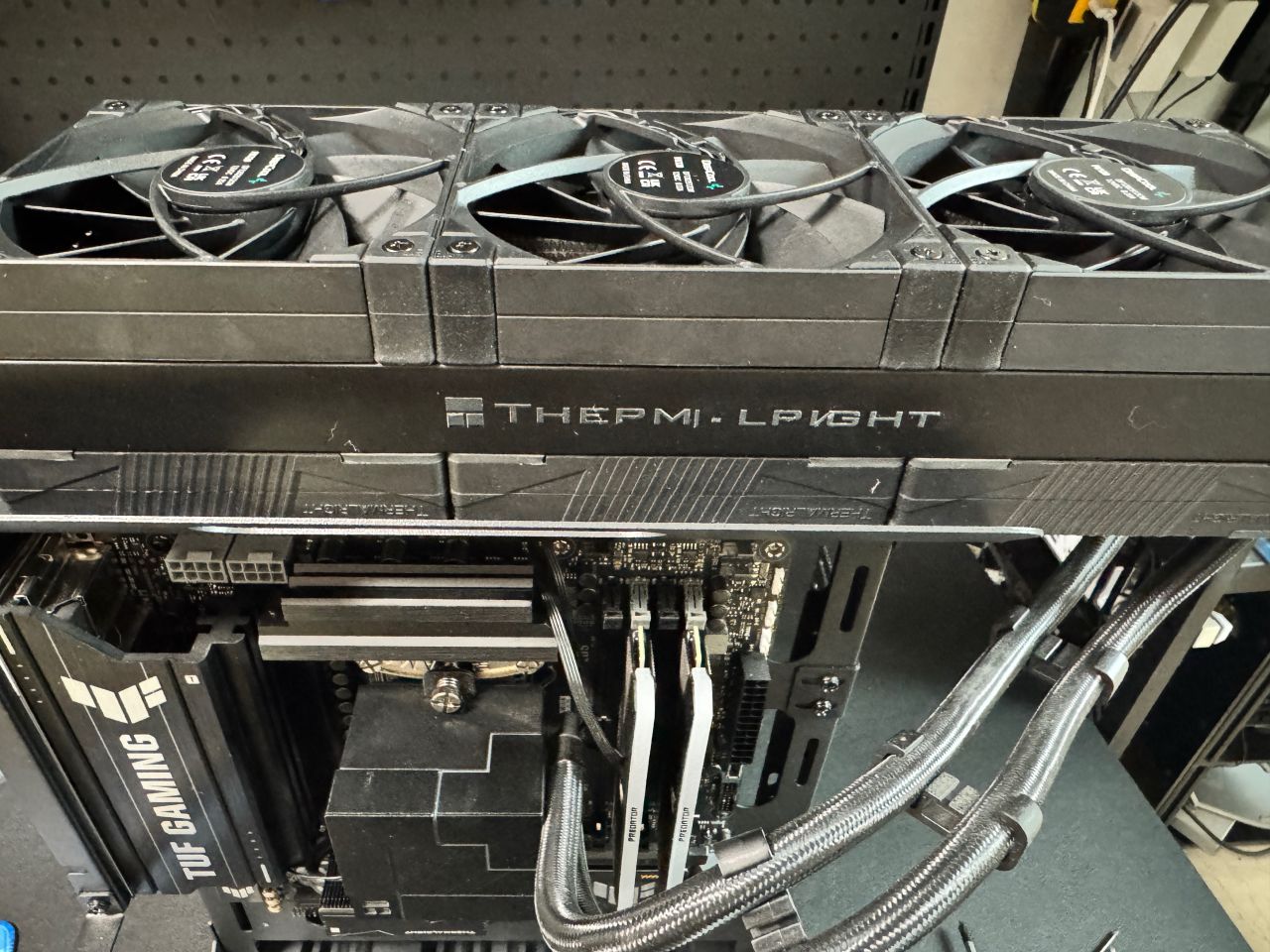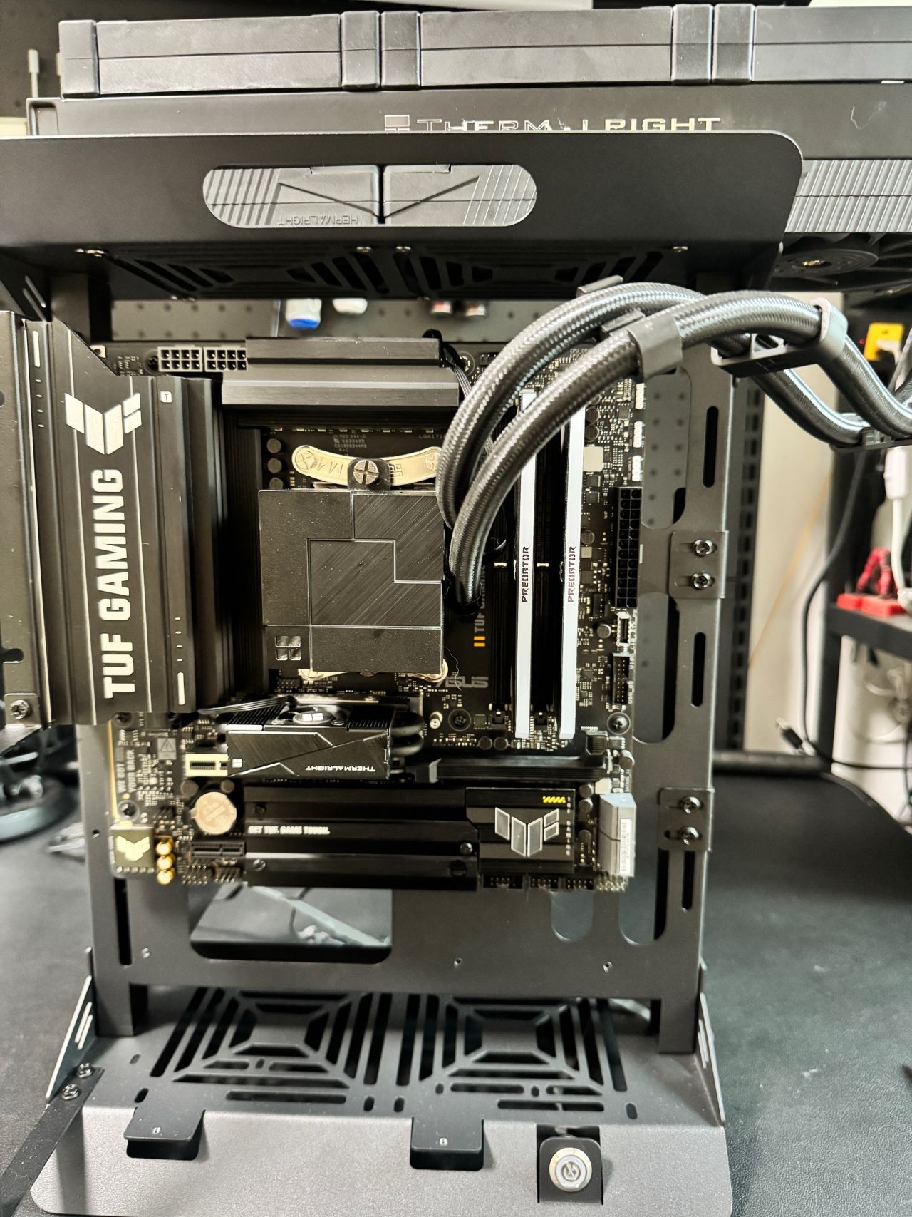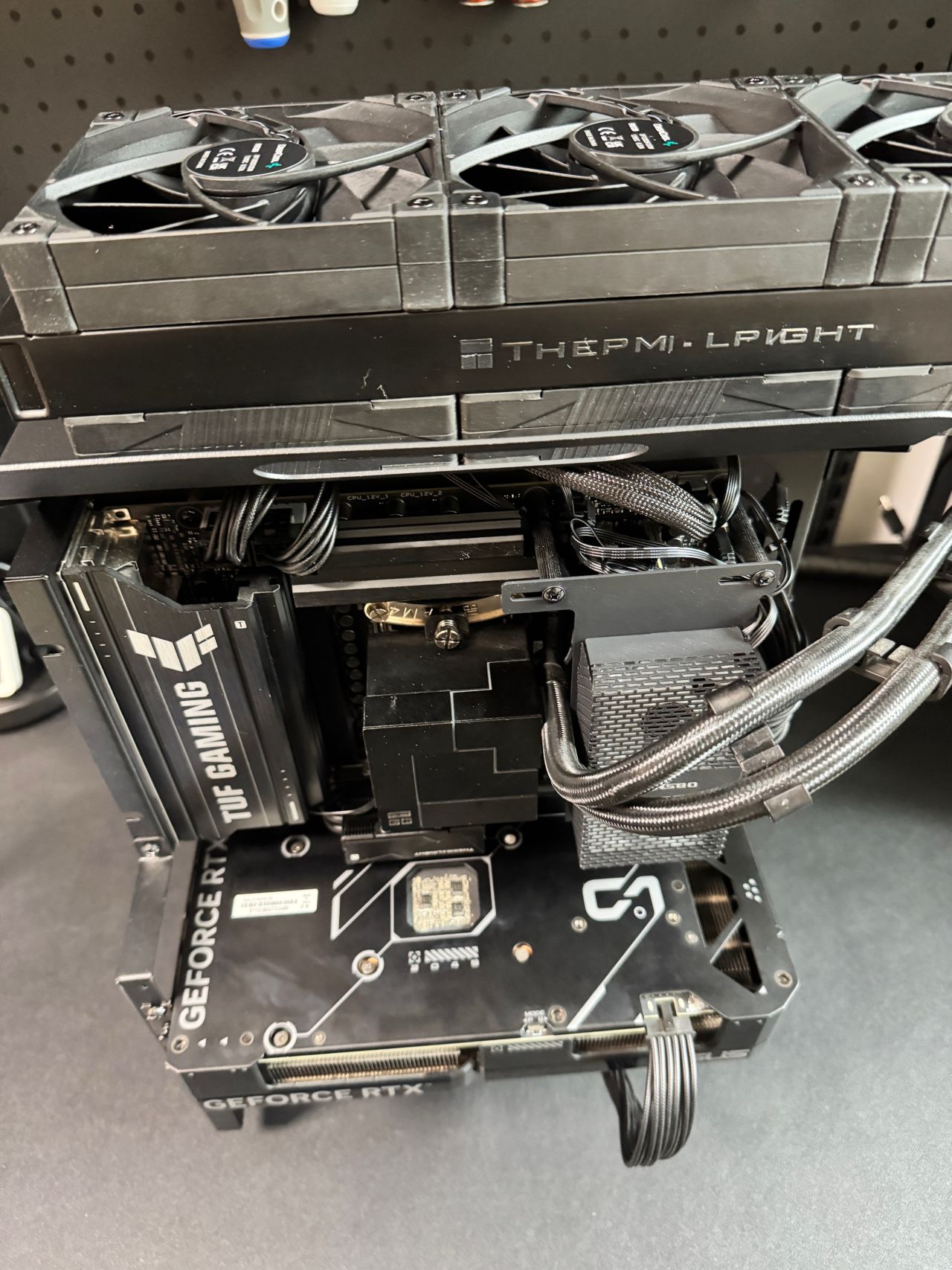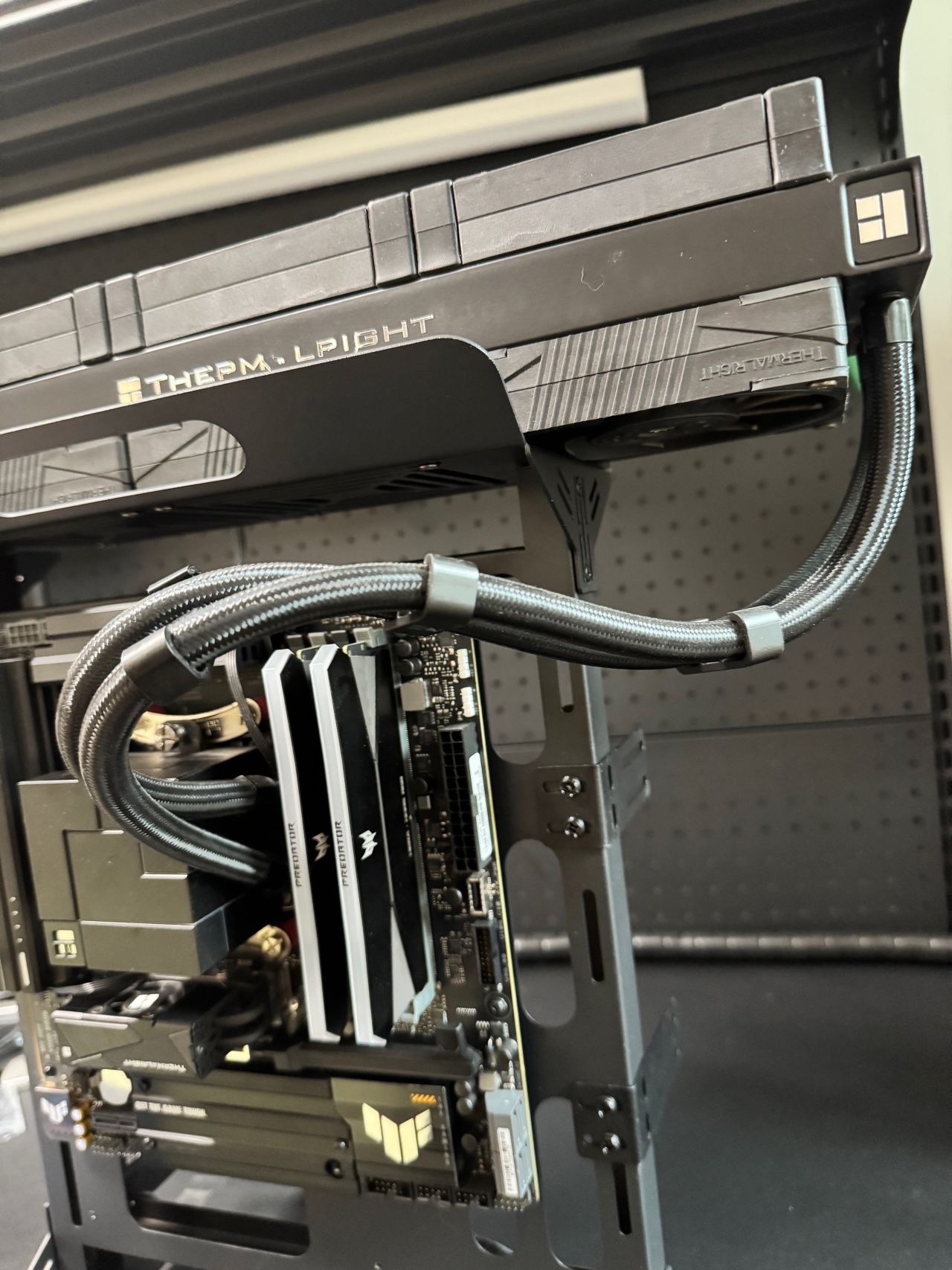 我這水冷前幾年的,不能下置位水冷管,右側水冷管的話就得打彎,整體醜確實醜了一點,但是絲毫不影響夾漢堡的性能。