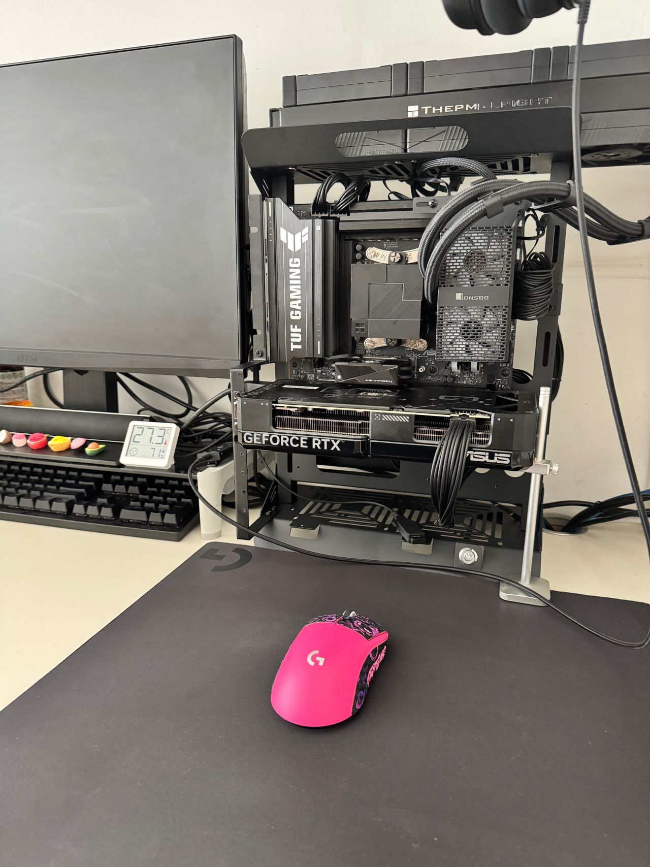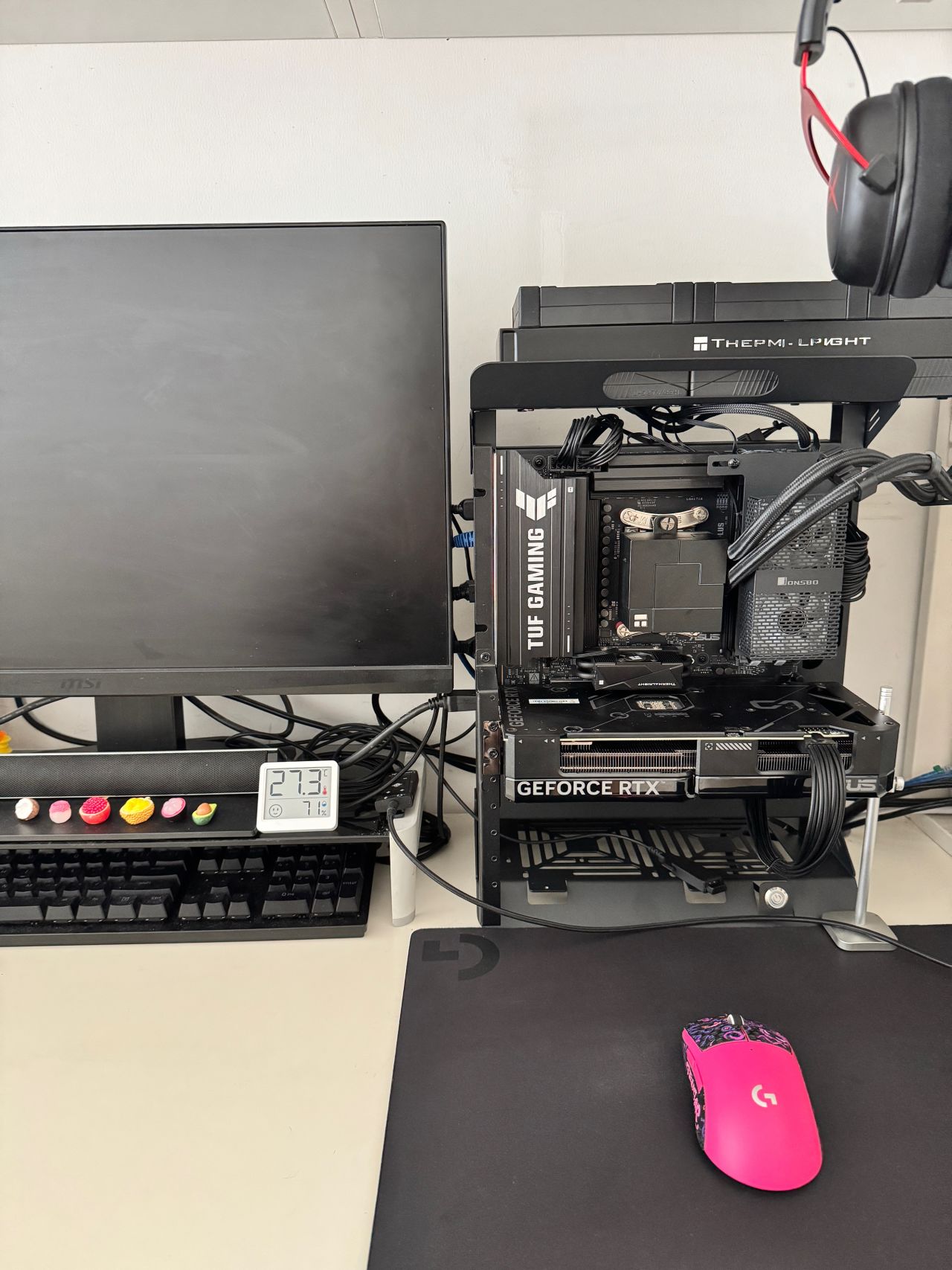 很多盒友怕落灰,髒了怎麼辦,我感覺都是過於焦慮,完全多慮,除非全天開窗,不然比放桌子下乾淨多了,再不濟買個街邊燒烤刷醬的那種毛刷子,每天刷吧兩下,絕對乾淨。家裏有養貓貓狗狗的,能上桌的那種,慎重考慮,另外貓毛狗毛又不會一直在空中飄,捲到顯卡或者風冷水冷風扇扇葉上。