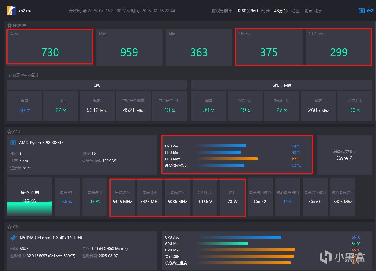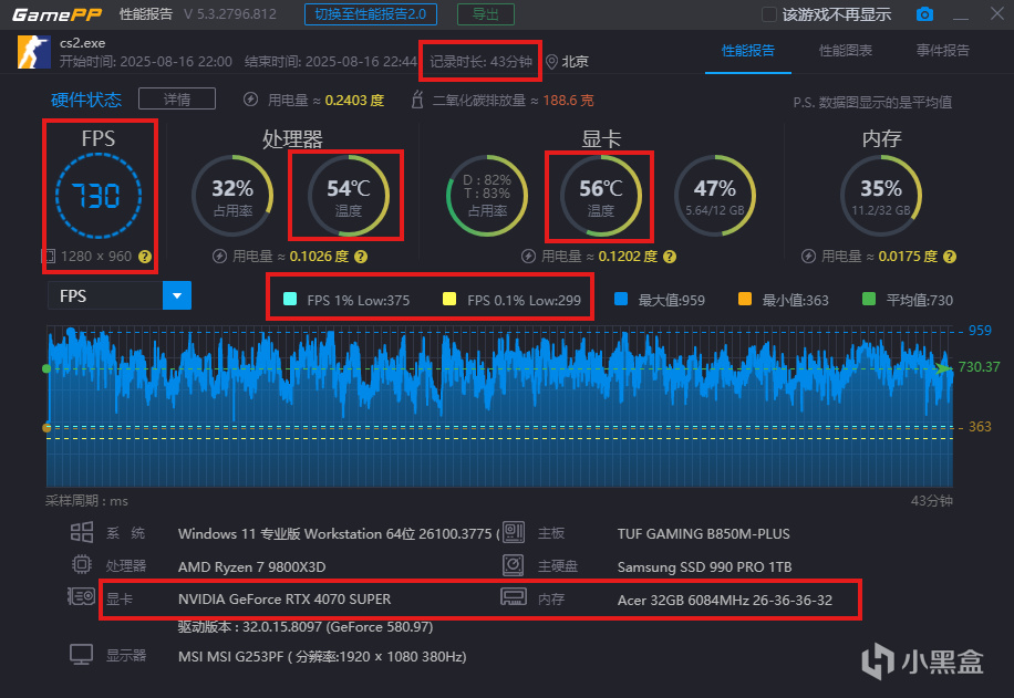 第二局:遊戲時長 43分鐘,平均FPS 730,CPU溫度 54度,顯卡溫度 56度。