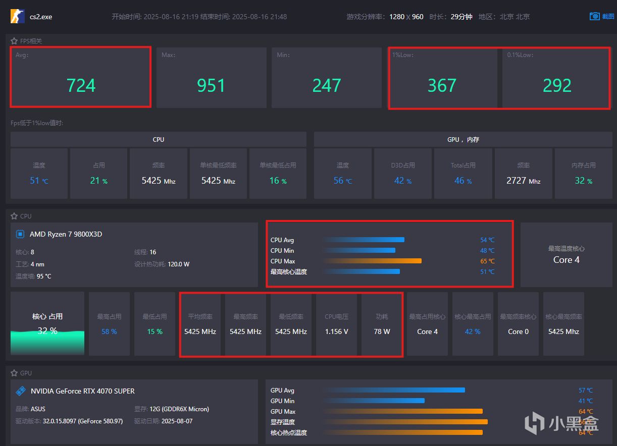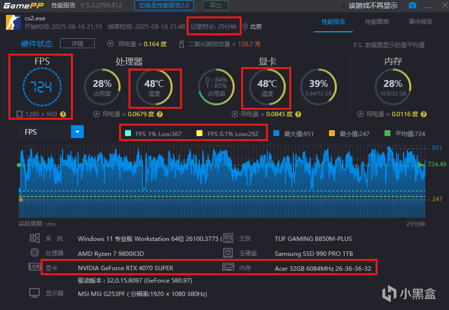 第一局:遊戲時長 29分鐘,平均FPS 724,CPU溫度 48度,顯卡溫度 48度。