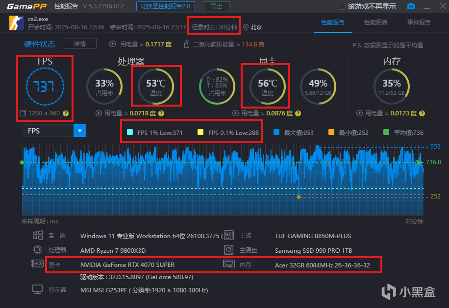 第三局:遊戲時長 30分鐘,平均FPS 737,CPU溫度 53度,顯卡溫度 56度。