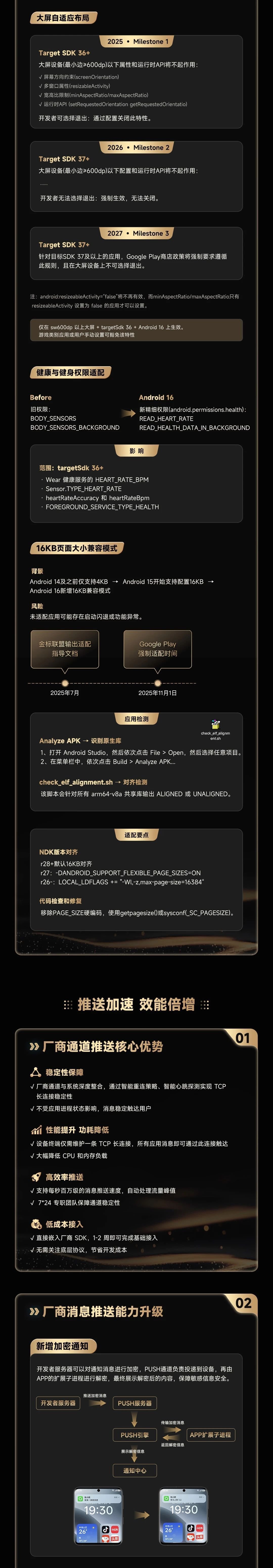 - 系统适配:解析 Android 16新特性 ,包括无边框设计强制、定时任务调度优化、大屏自适应布局(分阶段推进)、健康权限细化及16KB页面兼容等,同步发布适配指南。