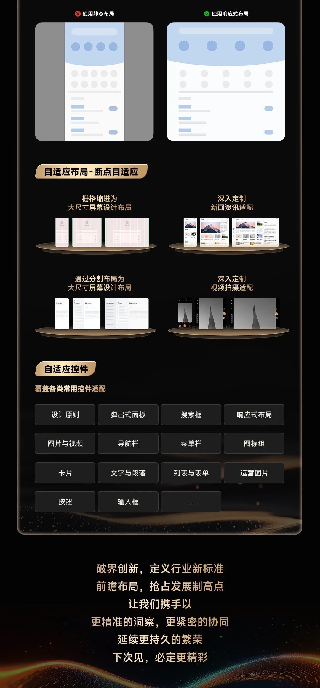 - 大屏生态:启动 大屏完美适配计划 ,从统一设计规范、断点适配到场景方案,覆盖导航、表单等控件,提升跨终端体验。