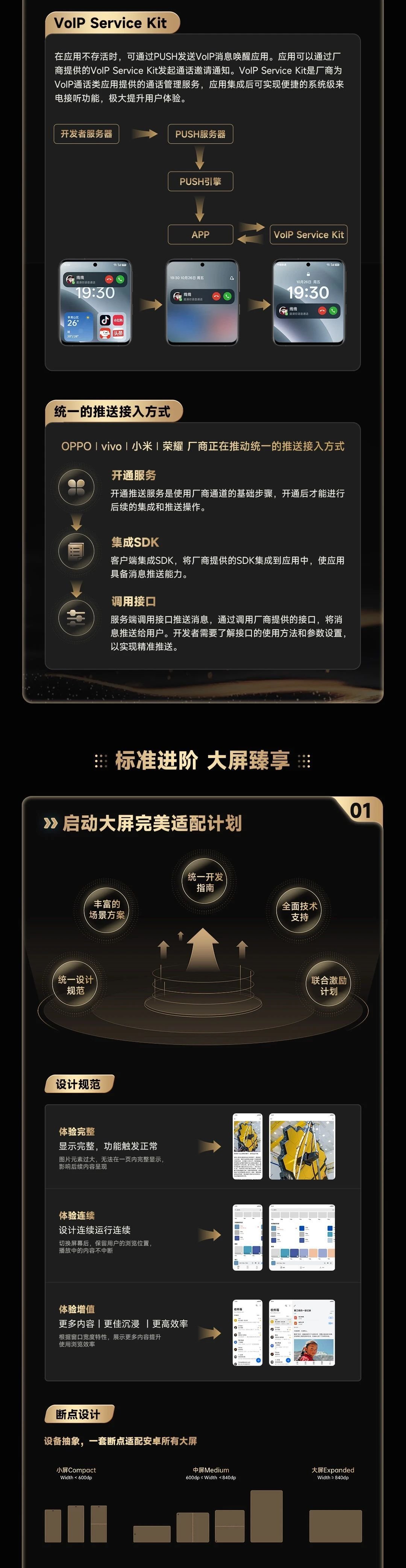 - 生态建设:完善隐私、性能等技术标准,优化金标认证;统一安卓系统接口,强化隐私管控;推进32位转64位、大屏适配,升级OS层推送与隐私权限体系。