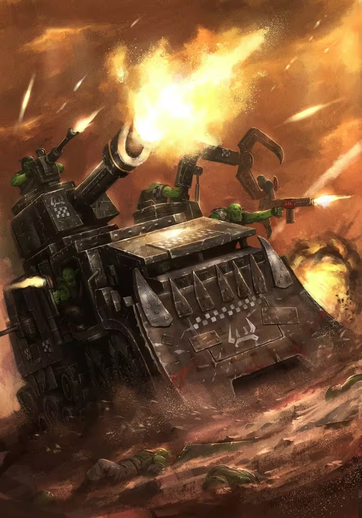 这些覆甲的铁皮坦克杀手铿锵前行,穿越弹雨。由死亡铁罐、杀人铁罐与毛哥金刚组成的装甲集群冲入敌军阵线与人类装甲军队针锋相对。动力爪撕扯炮塔的瞬间、圆锯伸入坦克舱内屠杀乘员。受害者的惨叫对兽人而言宛如仙乐。随着敌军坦克化为废铁,机甲集群用火力与暴力扭转了泰坦军团与古巨圾间的僵局。