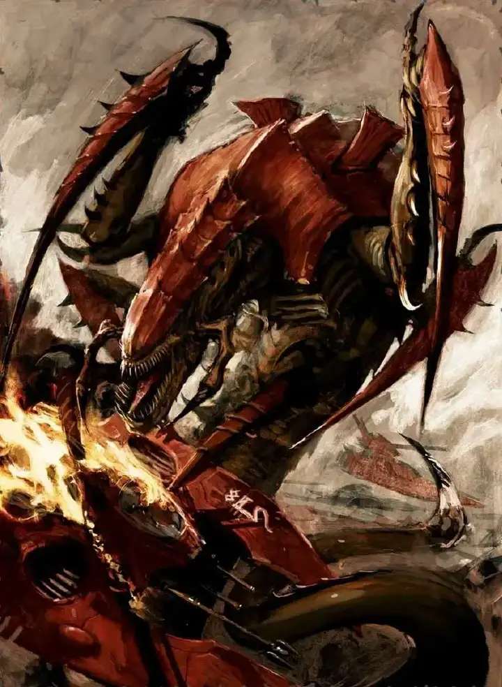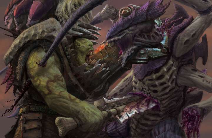 泰伦虫族的反击快得吓人。体型更大的虫群单位—挥舞镰刀肢体的庞然巨兽和搞哥金刚体型的怪物蹒跚着迎战这些从天而降的绿皮威胁。欧克塔里亚兽人的喧闹战吼戛然而止,因为他们知道这些高耸如山的巨兽本是虫族留作最后一击的杀手锏。当兽人防线被突破时,这些怪物本将收割战场。如今新来的兽人必将被撕成碎片,因为暴露在旷野中的步兵绝无生还的可能。