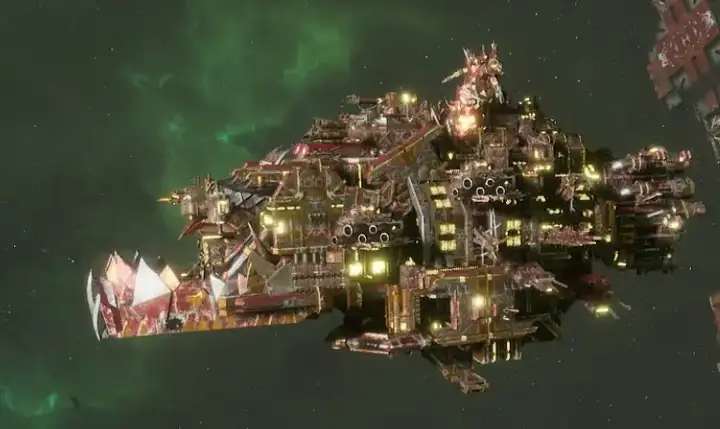 次日,乌尔克的黎明没有按时到来。但这次与恒星的异动无关。亚空间潮汐再次改道,恢复了上古时代的状态。随着亚空间的翻涌,一具庞大的太空废船被吐进佐尼亚星系的实体宇宙。此刻这具废船正漂浮在乌尔克轨道上,遮蔽了闪烁的恒星光芒。兽人们终于等到了这艘巨型废船。