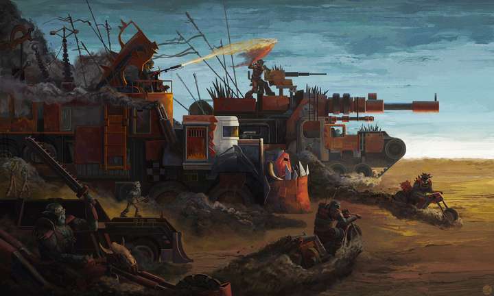 很快锈刺前哨站便拥挤到"连唾沫都落不到地上",于是撒拉卡率军西进。正是在"大荒原"的龟裂平原上,他遭遇了崛起路上的首次挫折。这里盘踞着当地最富有、最令人眼红的氏族:恶月氏族。其领袖战争头目斯纳兹达卡麾下那支明黄色战斗货车队,以其凶猛火力和机动性冠绝群伦。当发现撒拉卡的大军踏入领地时,斯纳兹达卡立即下令收起图腾柱、拆走帐篷,整个部落的转移速度"比驯兽师掐死逃跑屁精还快"。在随后的游击战中,恶月小子们总能在撒拉卡的军团反击前发射几轮炮击,然后扬长而去。