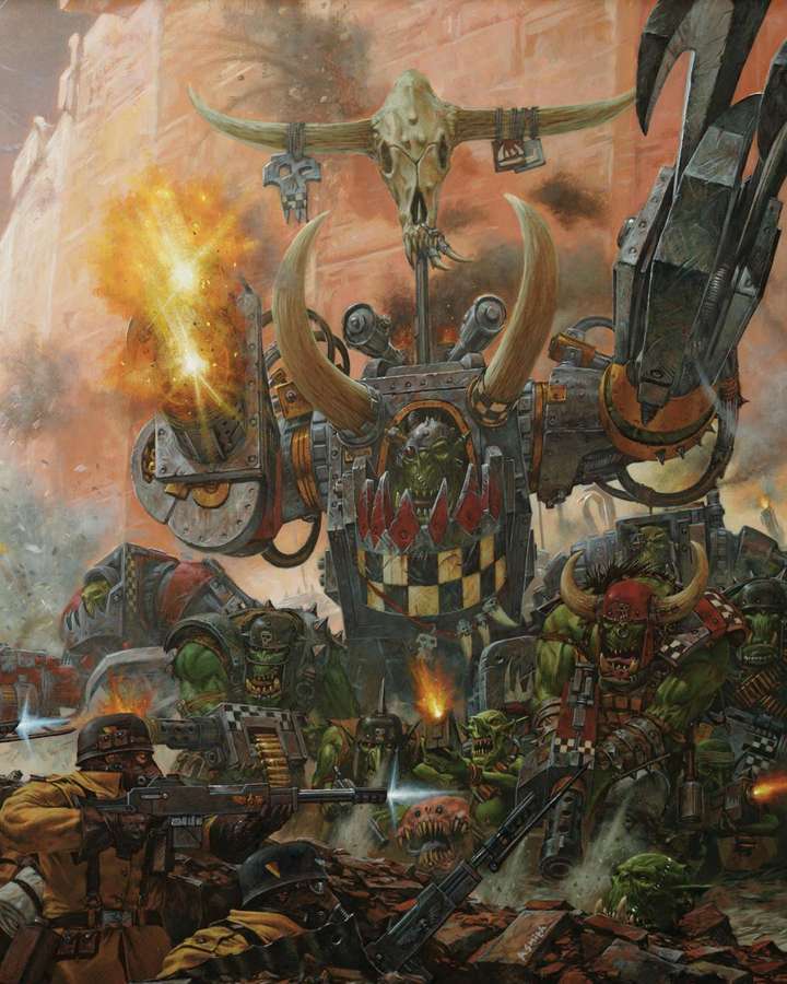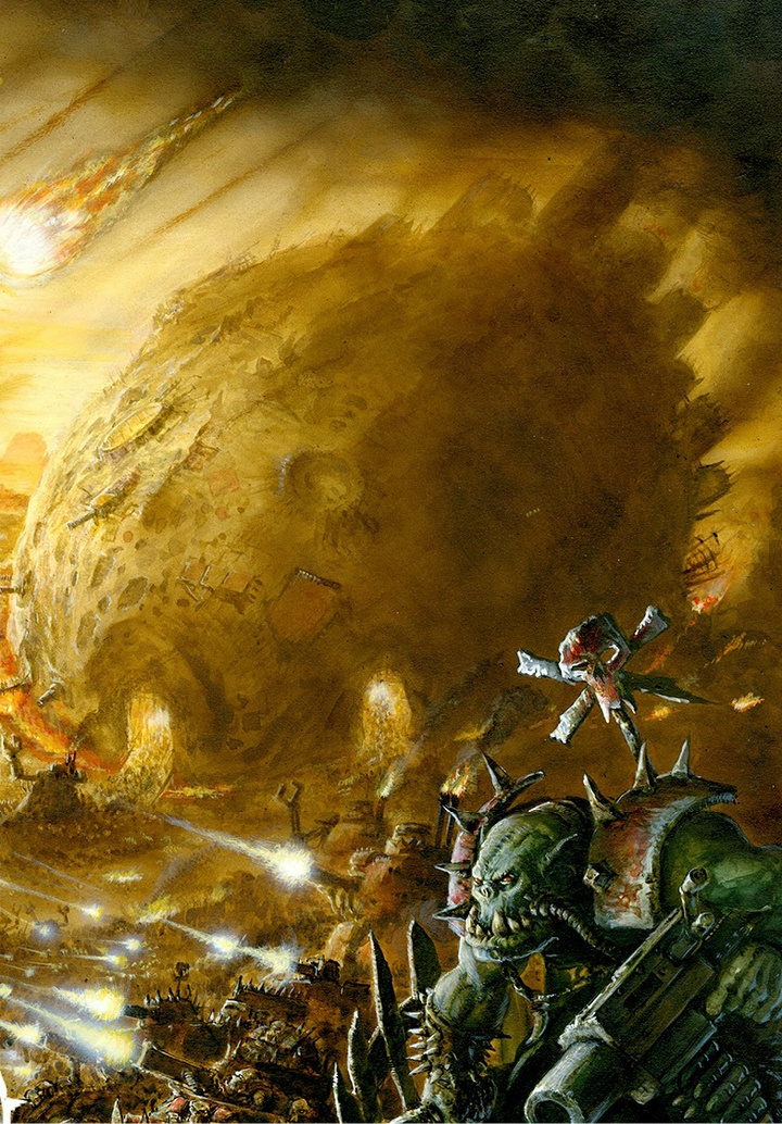 撞击的冲击波撼动了整个世界,扬起的尘埃足以遮蔽恒星的光芒,数十万绿皮在灾难性的着陆中瞬间汽化。但这不过是九牛一毛。当幸存者们从扭曲的船体残骸中涌出后,撒拉卡将部众们分为五大军团,交由五位最强大的军阀统领。这些曾在乌尔克被他亲自用暴力征服,随他南征北战统一乌尔克的猛将,此刻在遮天蔽日的尘埃中准备征服脚下的土地。撒拉卡挥舞动力爪,无穷无尽的战争机器与绿色狂潮开始扑向四面八方。