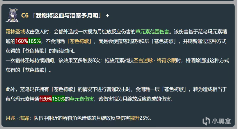 -次霜林圣域持续期间,该效果至多触发8次;施放元素战技圣言述咏·终宵永眠时,将清除通过这种方式获得的「苍色祷歌」。 此外,菈乌玛在拥有「苍色祷歌」的情况下进行普通攻击时,会消耗一层「苍色祷歌」,转为造成相当于菈乌玛元素精150%的草元素伤害,该伤害视为月绽放反应造成的伤害。