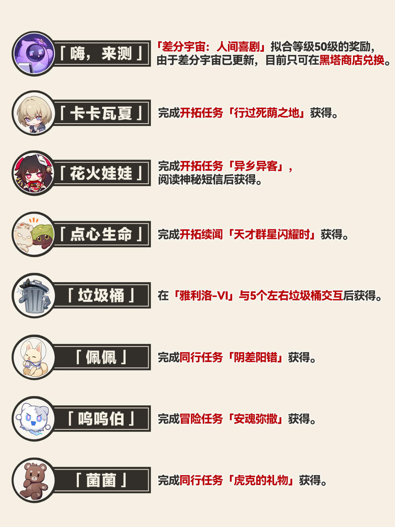 同行任务、开拓续闻这些可以从任务面板左下角的“命路歧图”中找到,其他获取方式的详细获取方法都写在图上啦!