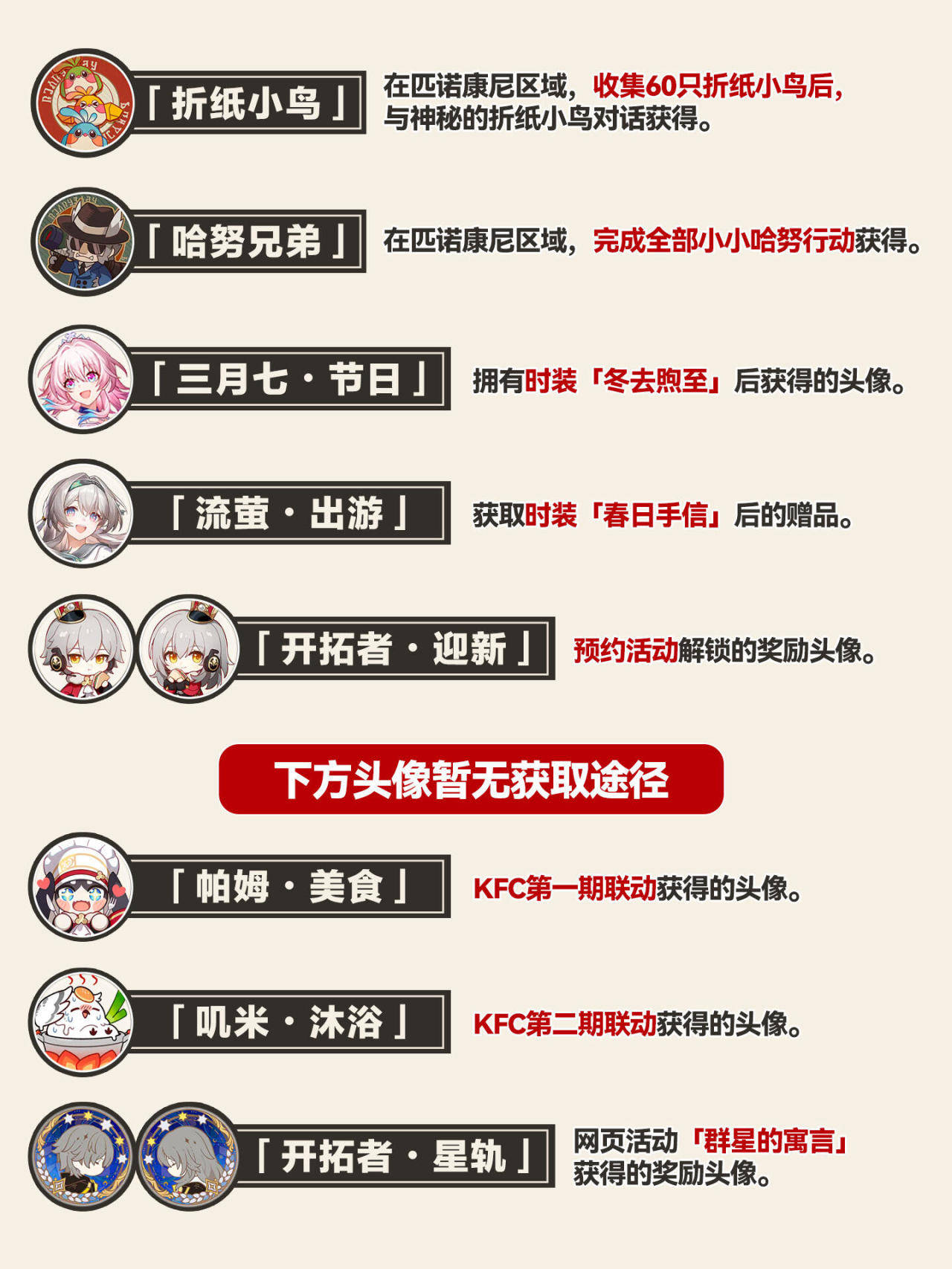 今天给大家整理了崩坏:星穹铁道开服V1.0-3.5至今所有头像的获取方式~