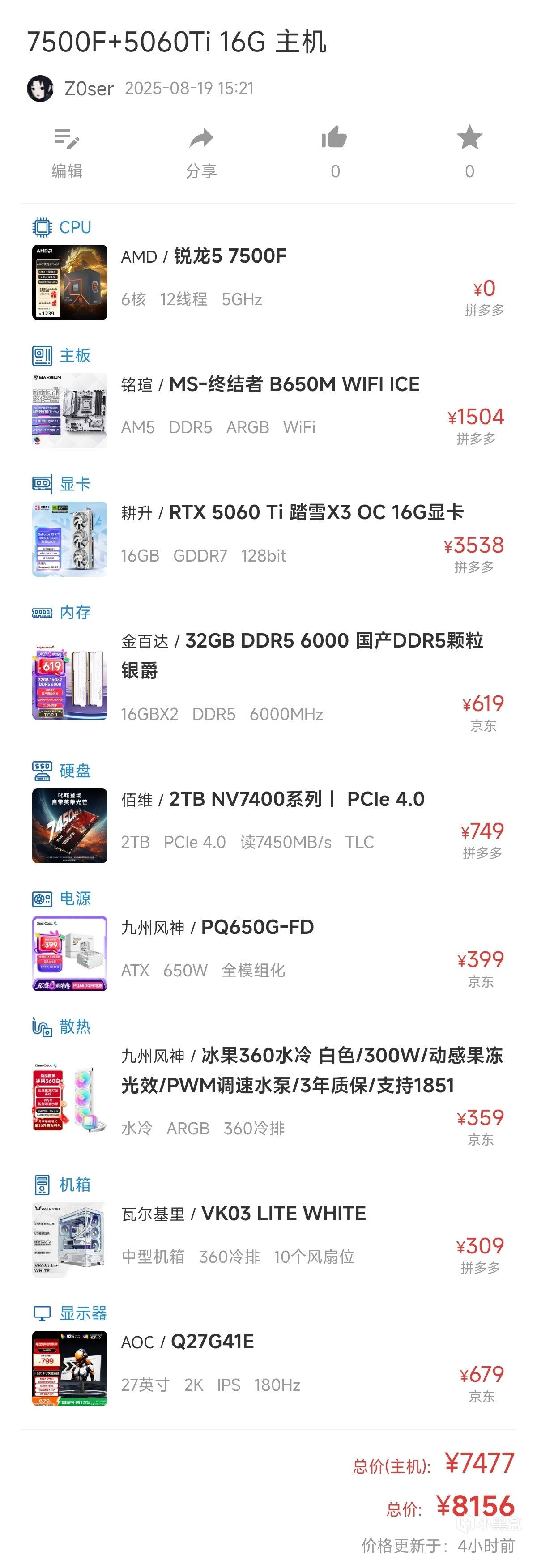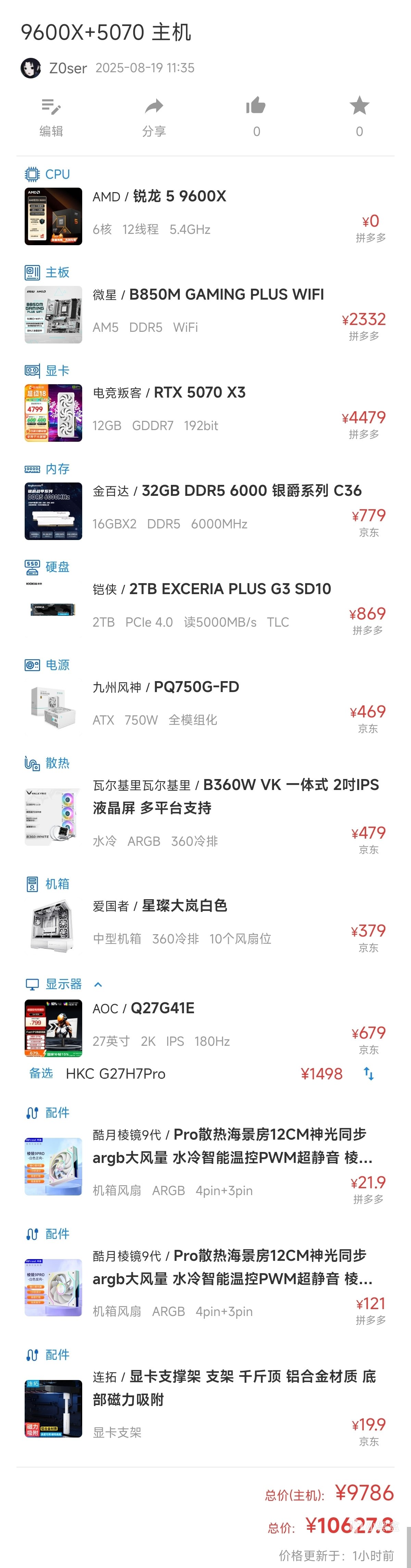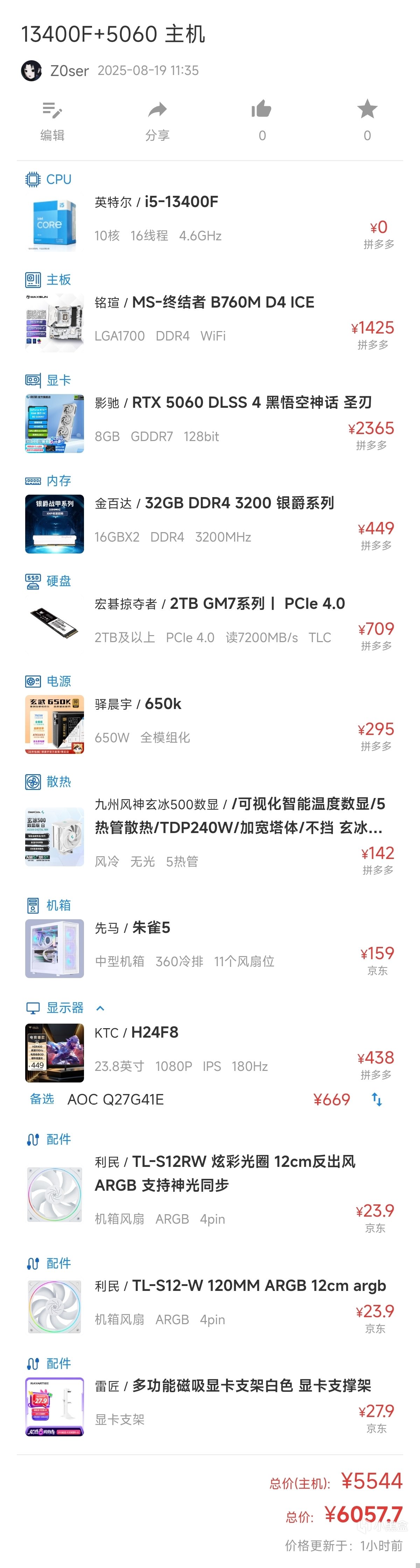 还有大家如果觉得偏贵可以自己修改,白色普遍比黑色贵,D5比D4贵,高端卡比旗舰卡贵。显卡我觉得5080以下都可以考虑入门级显卡的,旗舰没有那么划算。