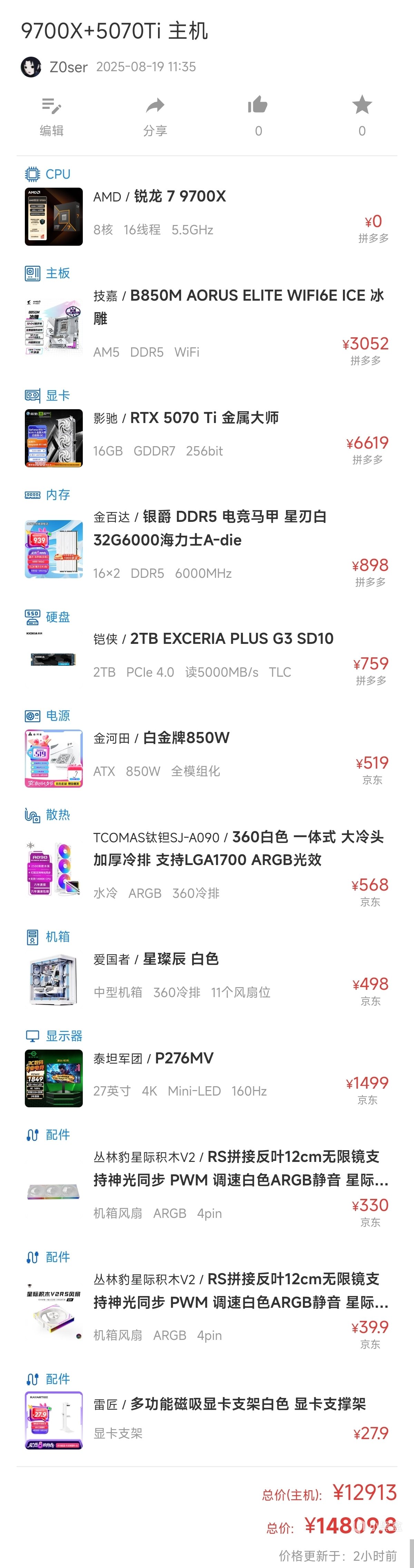 最近看到很多显卡都在降价,特别是5070Ti,现在丐版的5070Ti已经跌倒了6299这个首发价以下了,所以现在其实挺适合配电脑的。我是5月配的5070Ti,当时买个入门的电竞叛客花了6599,跟现在比肯定亏了。所以我自己写了几套纯白的颜值主机供大家参考。论性价比肯定不是最好的,但好看是真的好看。大家其实也可以根据自己的需求调整配置,使它变得有性价比。