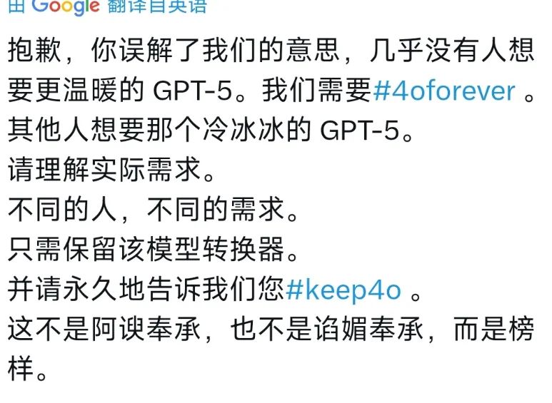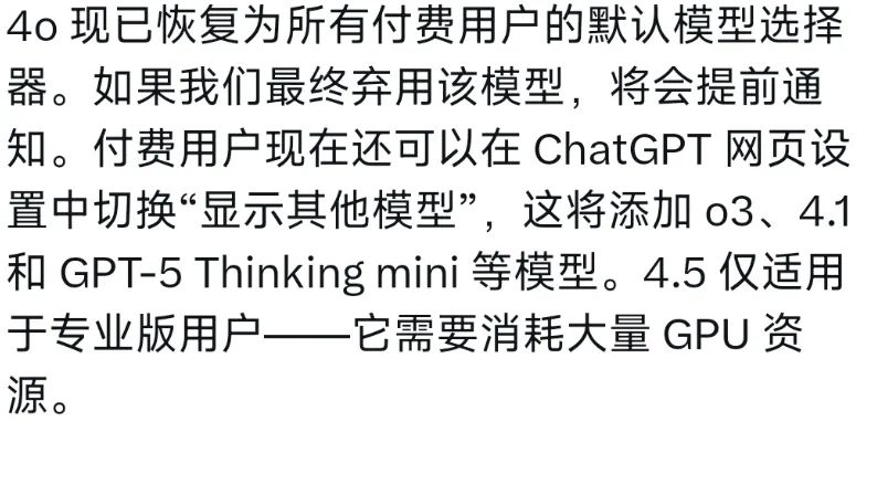在舆论压力下,OPEN AI又不得不将chat-4o版本添加回来,并且在gpt-5中,为用户增添了一定的选择。