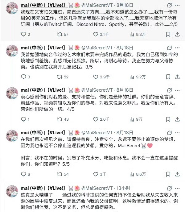 近日,英文區22歲的玩家代號“Vtuber 「mai 」”因父母認爲其玩遊戲及其直播不務正業,被迫暫停所有直播活動一事