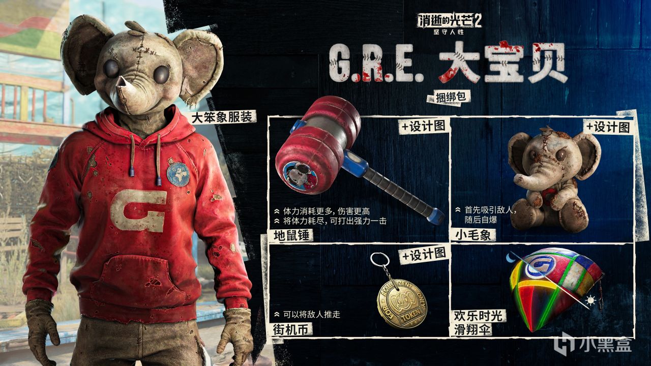 《消逝的光芒2》樂趣還不止這些。穿上前GRE吉祥物“大笨象”的服裝,打跑討厭的怪物,保護孩子們的歡樂時光。全新大寶貝捆綁包已經在遊戲裏的商店上架,不光有大笨象套裝,還附帶了一個可愛到死的毛絨玩具爆炸物。