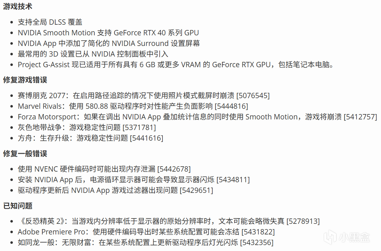 根据驱动的发行说明,新的 GeForce 驱动程序修复了《赛博朋克2077》在启用路径追踪的情况下使用照片模式截屏时崩溃的问题;《漫威争锋》中的性能问题;《极限竞速》中在调出 NVIDIA App 叠加统计信息时使用 Smooth Motion 的游戏崩溃问题;并修复了 《灰区战争》 和《方舟:生存进化》的游戏稳定性问题。