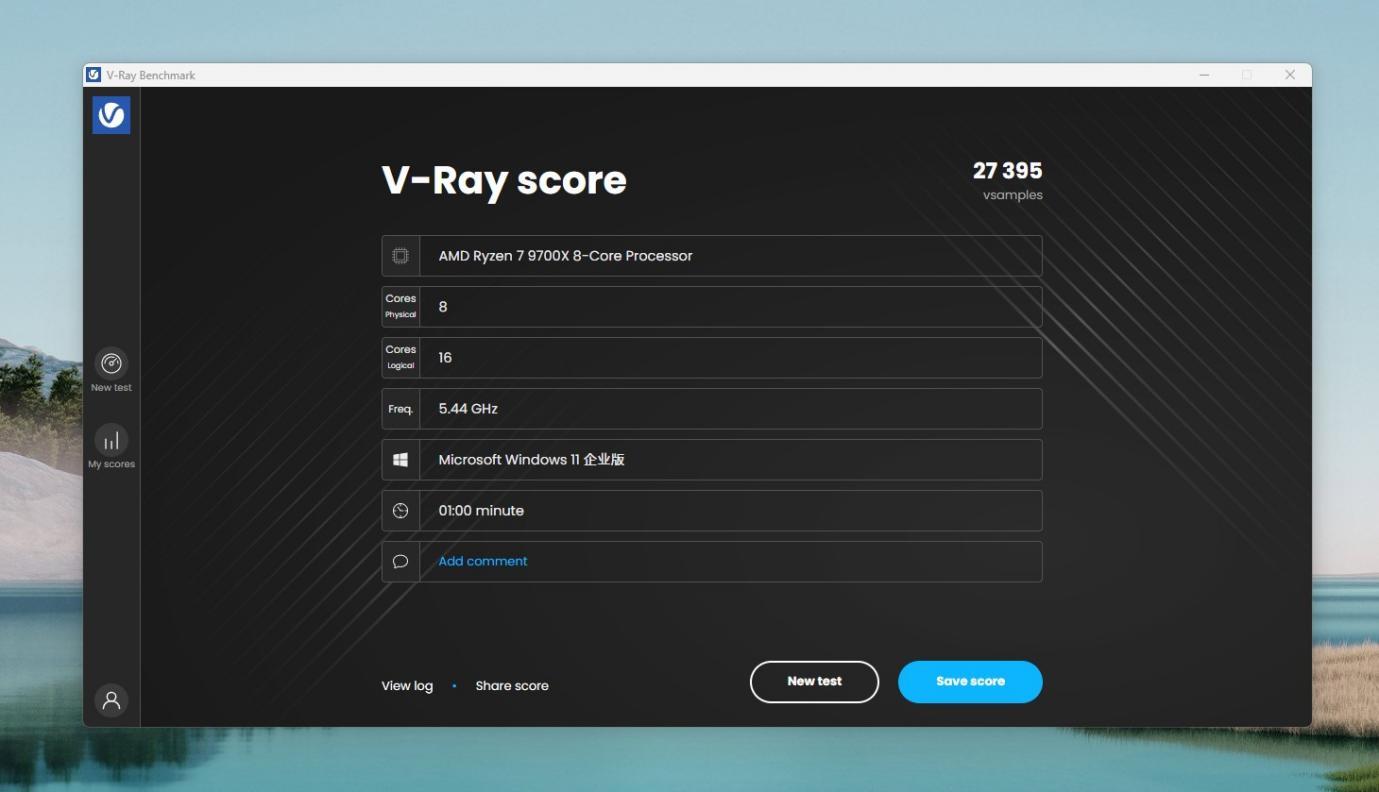 V-RAY CPU测试,跑分27395,前值是25039,再之前是23001,步步提升。