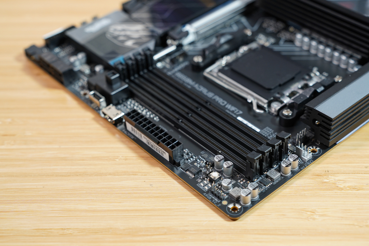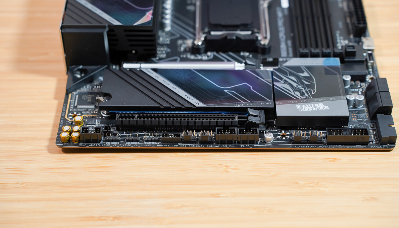 四根DDR5内存插槽,支持最大256GB容量,内存超频最高到8600MT/s,并且支持D5黑科技提升性能,后面我们来验证一下。在内存槽边上有CPU_FAN接口和PUMP_FAN接口,水泵接口有不同颜色区分。另外一侧则是有ARGB灯控接口。