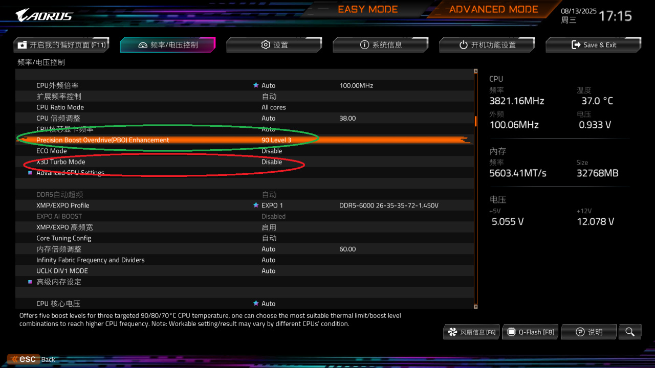 我们选择高的温度上限90,然后选择中间的档位级别3,就是绿色框的。注意下面有个X3D 增强模式,如果你的CPU是代X3D的可以选择用来增强游戏性能。