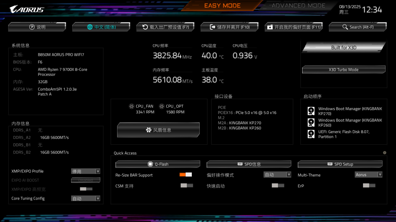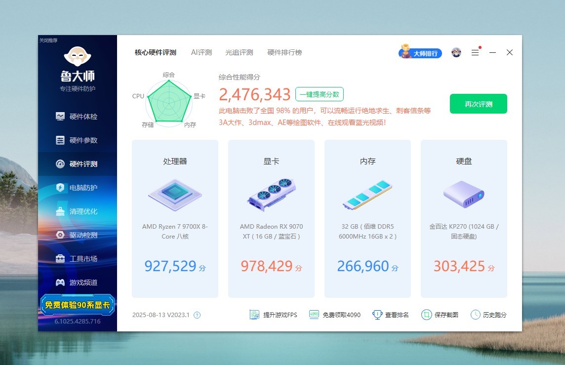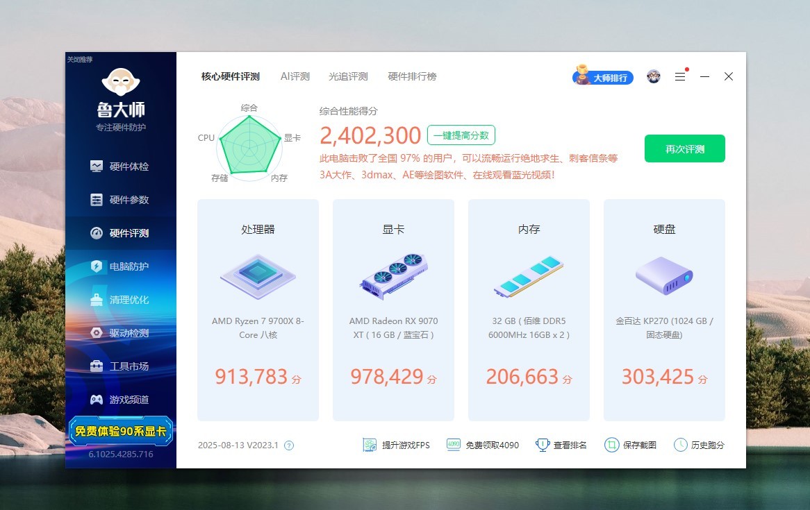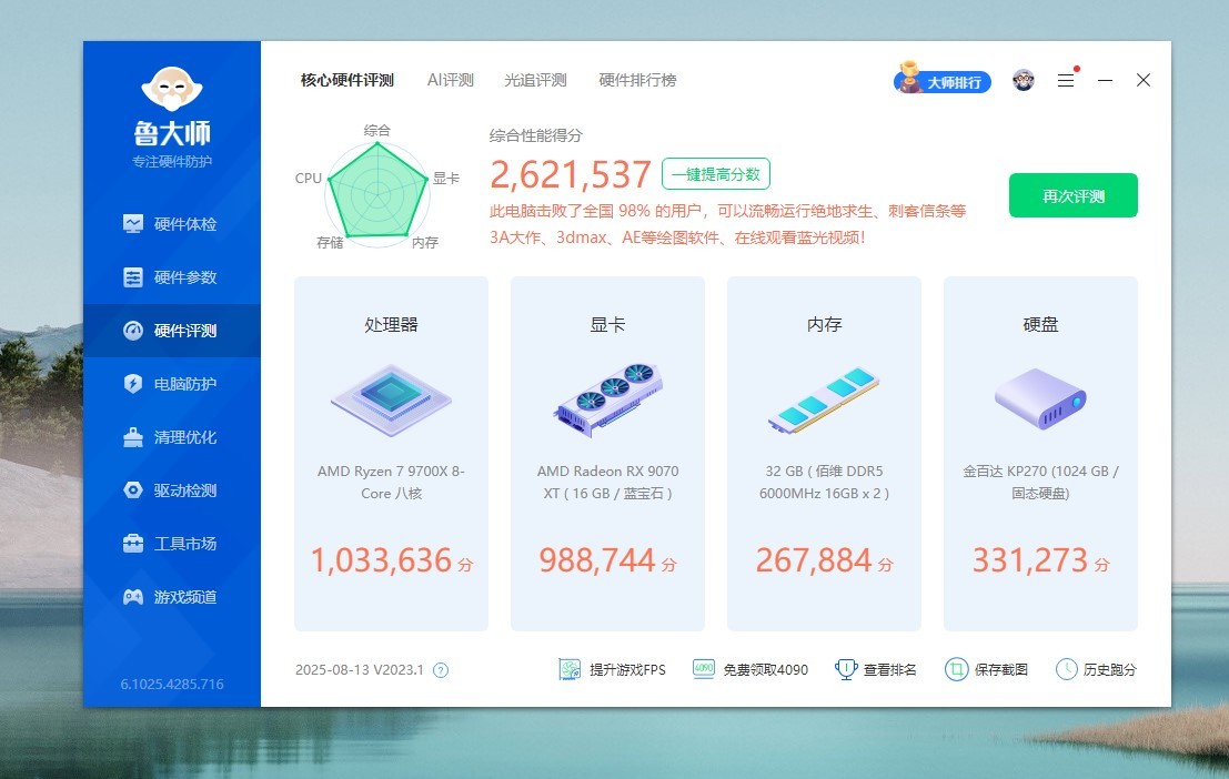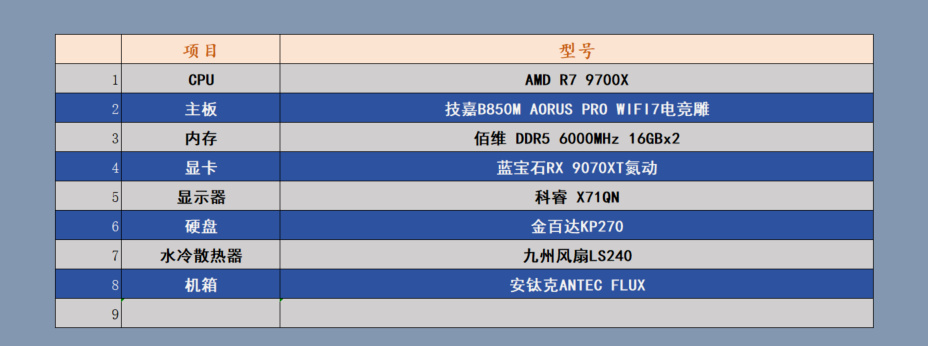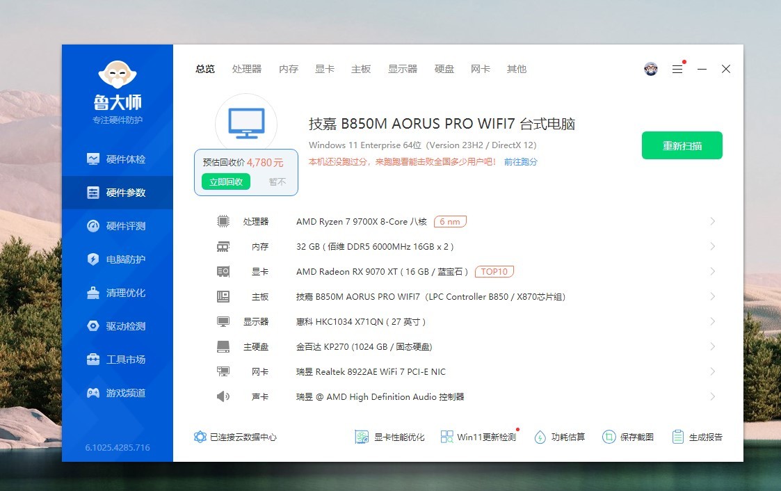 看看电脑的基本配置,CPU是AMD R7 9700X,主板是技嘉B850M AORUS PRO WIFI7,内存是佰维DDR5 6000MHz CL26,显卡是蓝宝石RX 9070 XT氮动,硬盘是金百达KP270,显示器是科睿X71QW,2K高刷显示器。