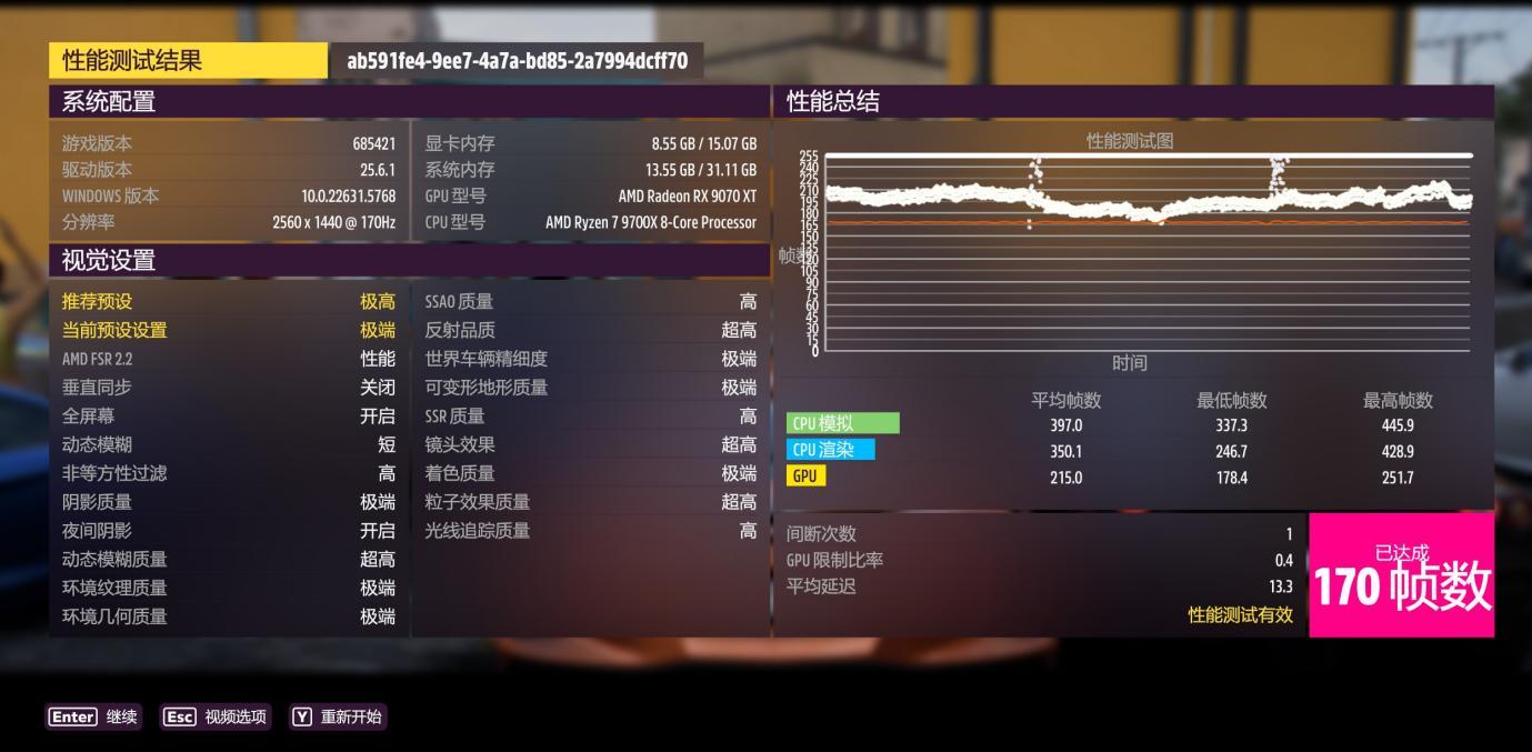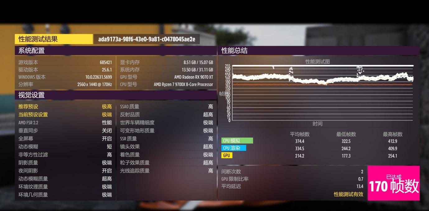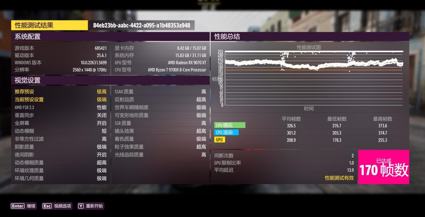 地平线5测试,极高画质,CPU模拟平均帧数326.5,CPU渲染301.2。