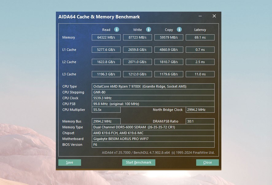 AIDA64 内存测试,读取速度提升到了60000MB/s左右,前面是50000MB/s。延迟仅为69.1ns,之前是97.5ns。
