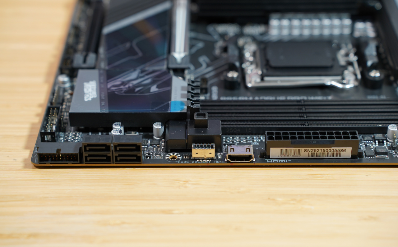 在24PIN主板电源接口的边上,我们看见有一个HDMI接口,可以用于连接现在流行的机箱内部显示屏,而无需接线到机箱外面,走线更简单。前置USB-A和USB-C接口齐全,而且这里的USB-C支持 USB 3.2 Gen 2x2 20Gbps速率。中间则是有4个SAT接口。在内存槽边上的方形按钮,是显卡快拆按钮,按动即可解锁显卡插槽,拆卸显卡更加简单方便。