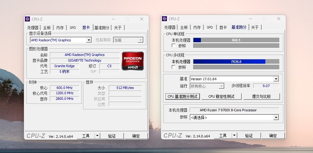 CPU-Z测试,单核842.1,多核7636.6。